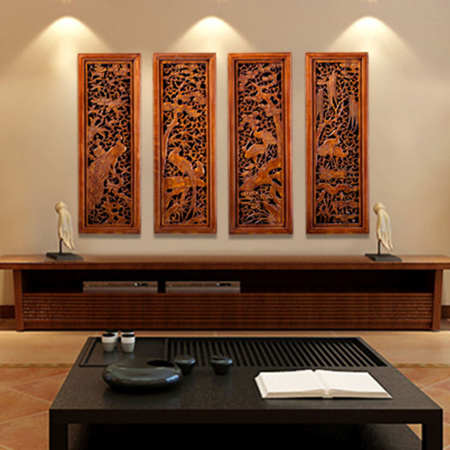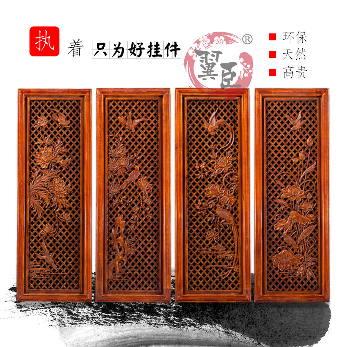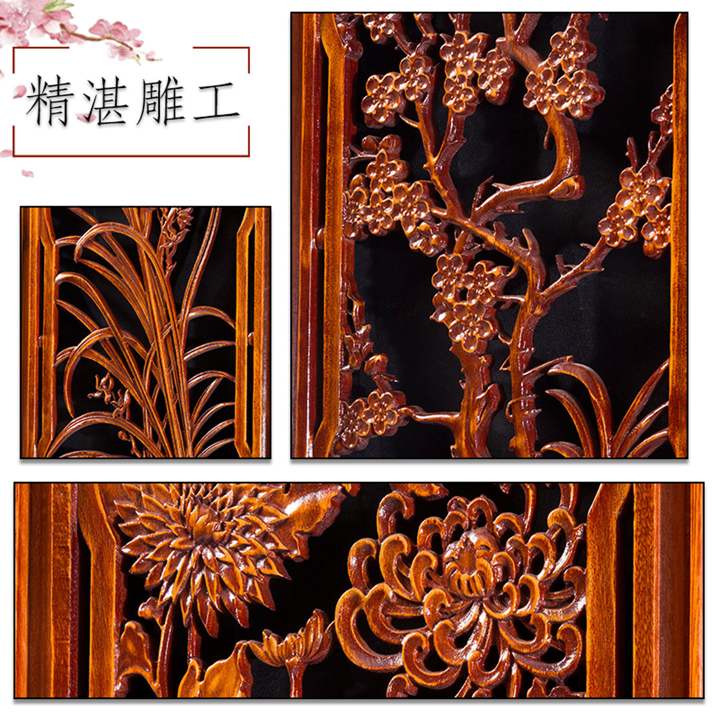 东阳木雕香樟木中式电视背景墙挂件玄关客厅四条屏梅兰竹菊工艺品