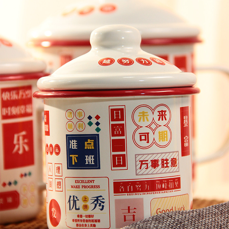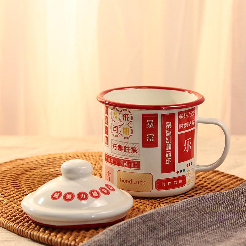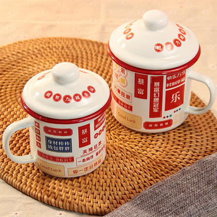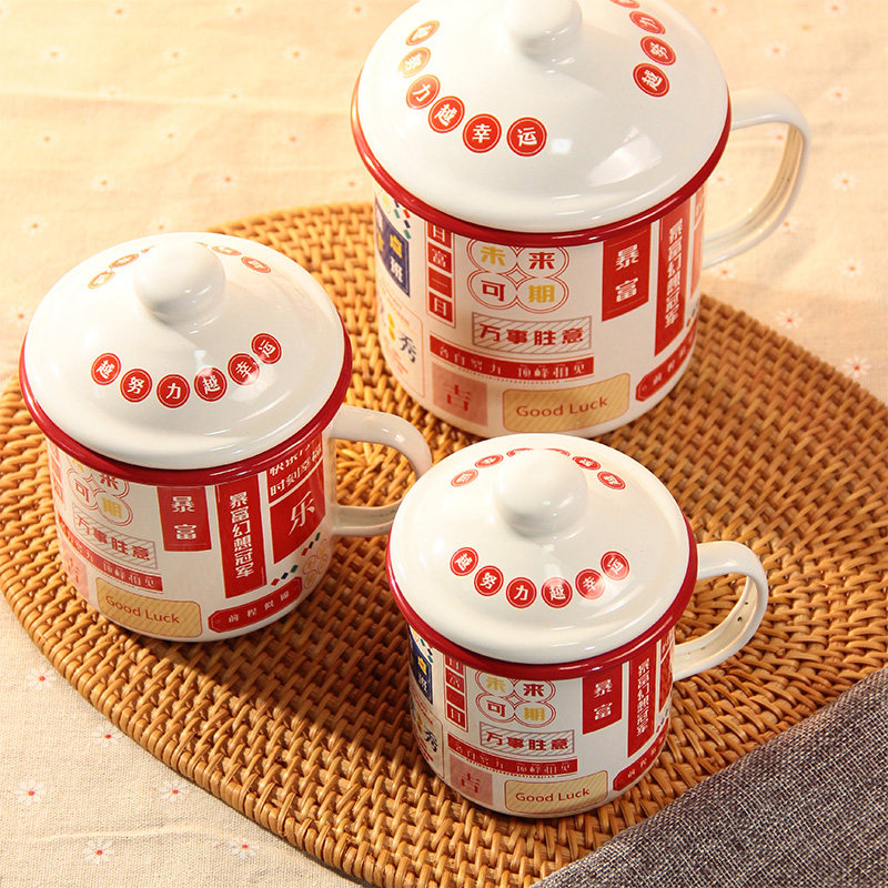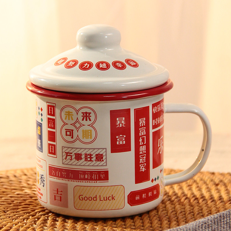 加厚珐琅搪瓷杯暴富红边发财杯带盖水杯泡茶杯马克杯500-1250ML