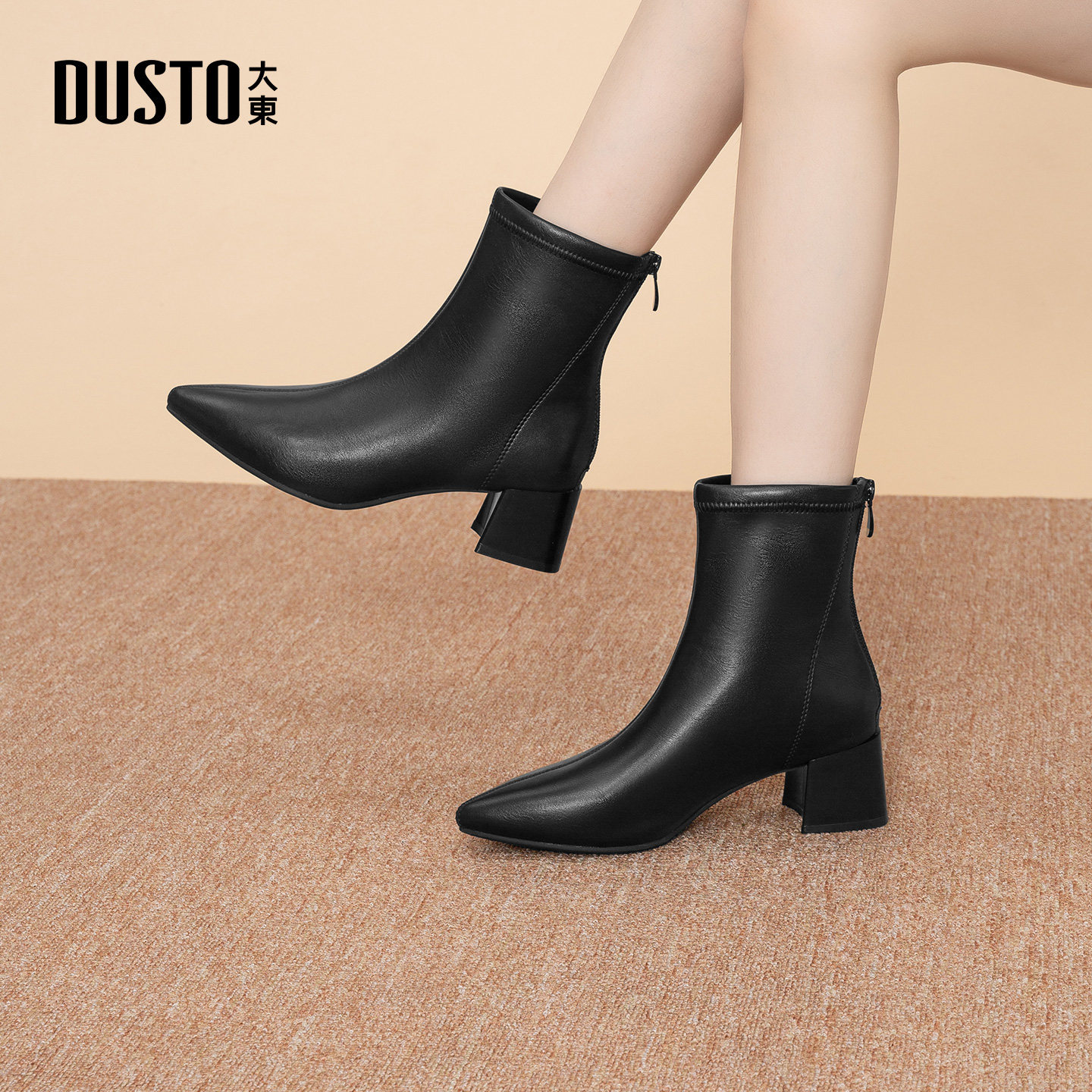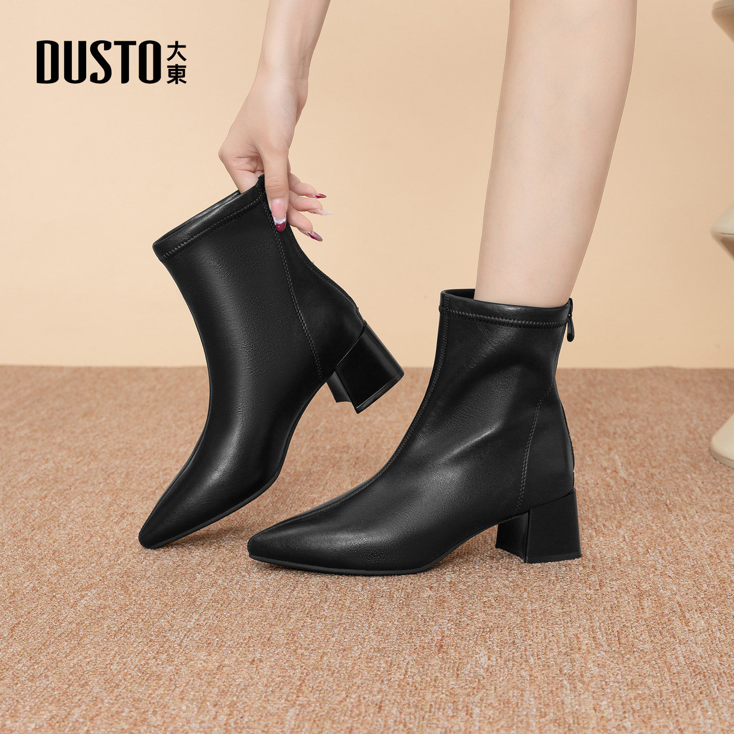 大东时装靴短靴2025冬季新款时尚尖头瘦瘦靴百搭通勤单里粗跟女靴
