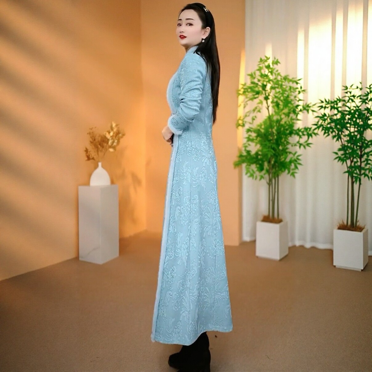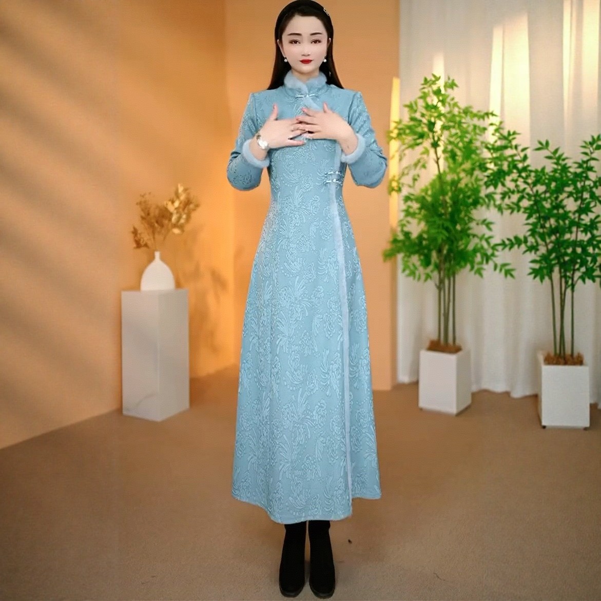 妈妈优雅气质秋冬款连衣裙高档云锦丝提花加绒加厚新中式旗袍裙子
