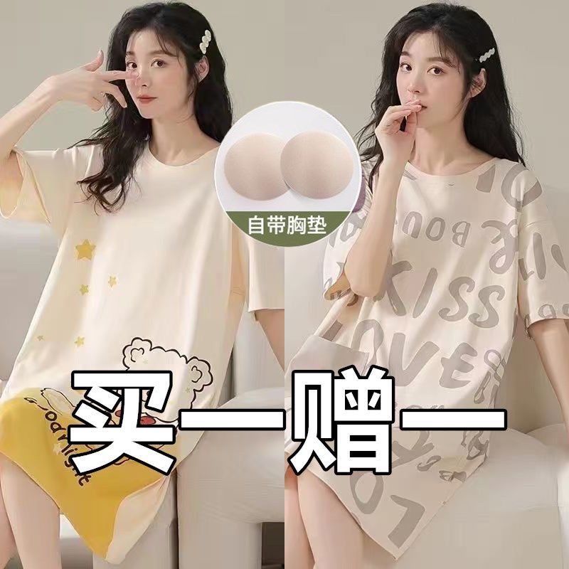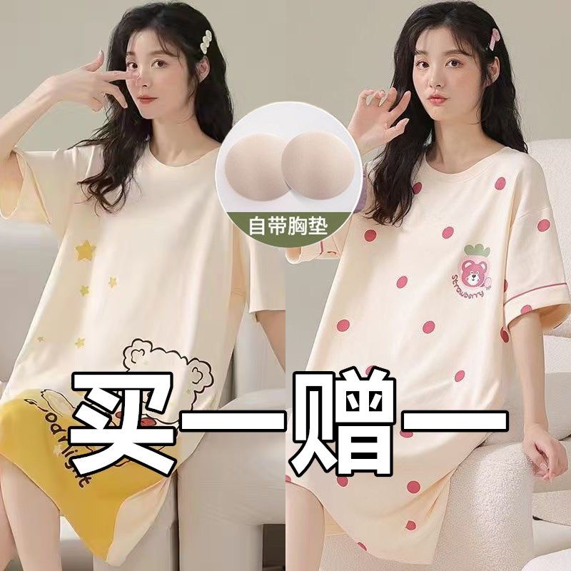 带胸垫条纹睡裙女夏季纯棉大码孕妇防凸点保守一体式连体凉快睡衣