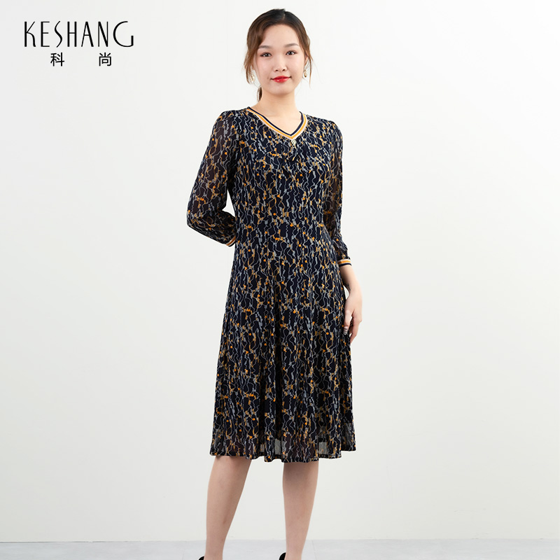 科尚中长款连衣裙女2024春季新款V领收腰显瘦长裙七分袖A字长裙子