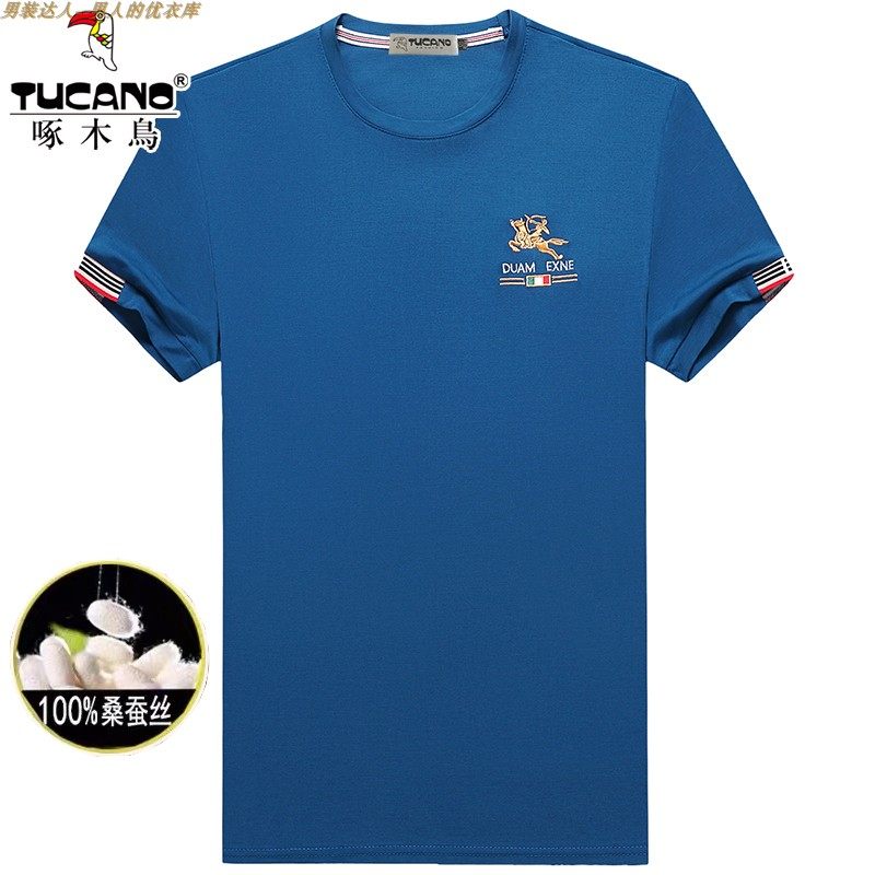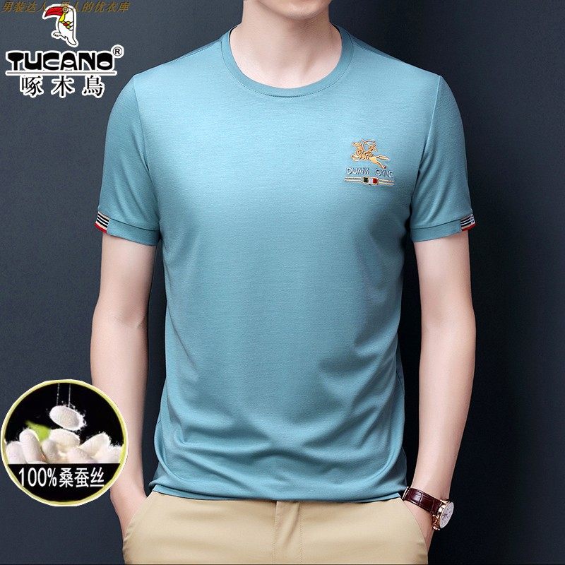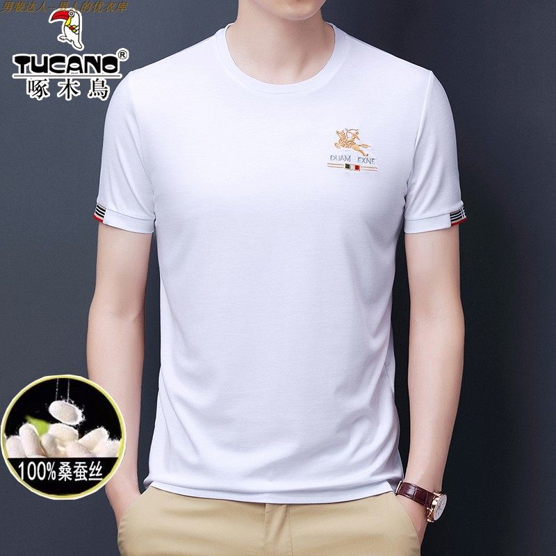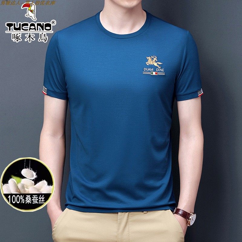 啄木鸟桑蚕丝短袖t恤男士青年高端休闲刺绣薄款圆领冰丝体恤衫潮