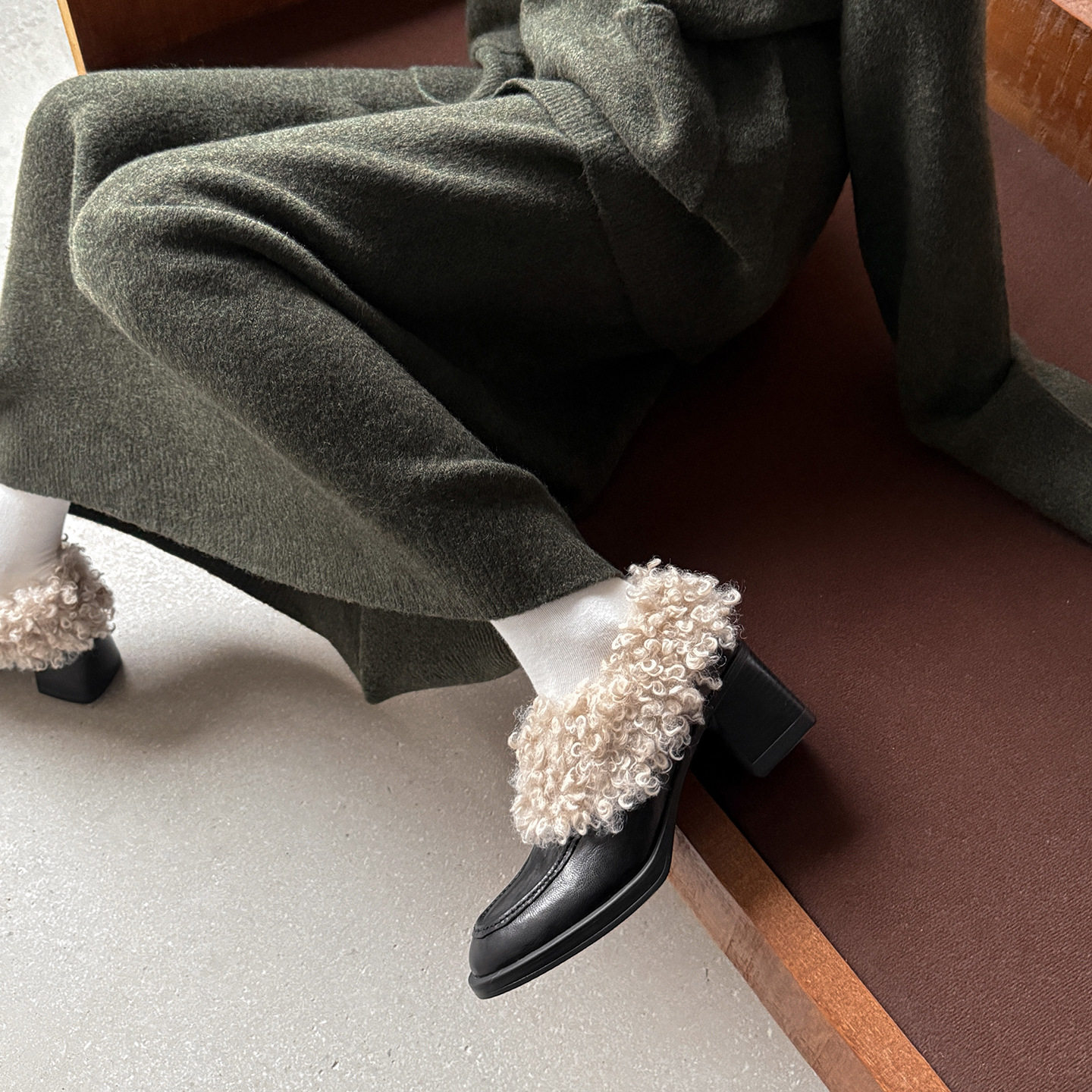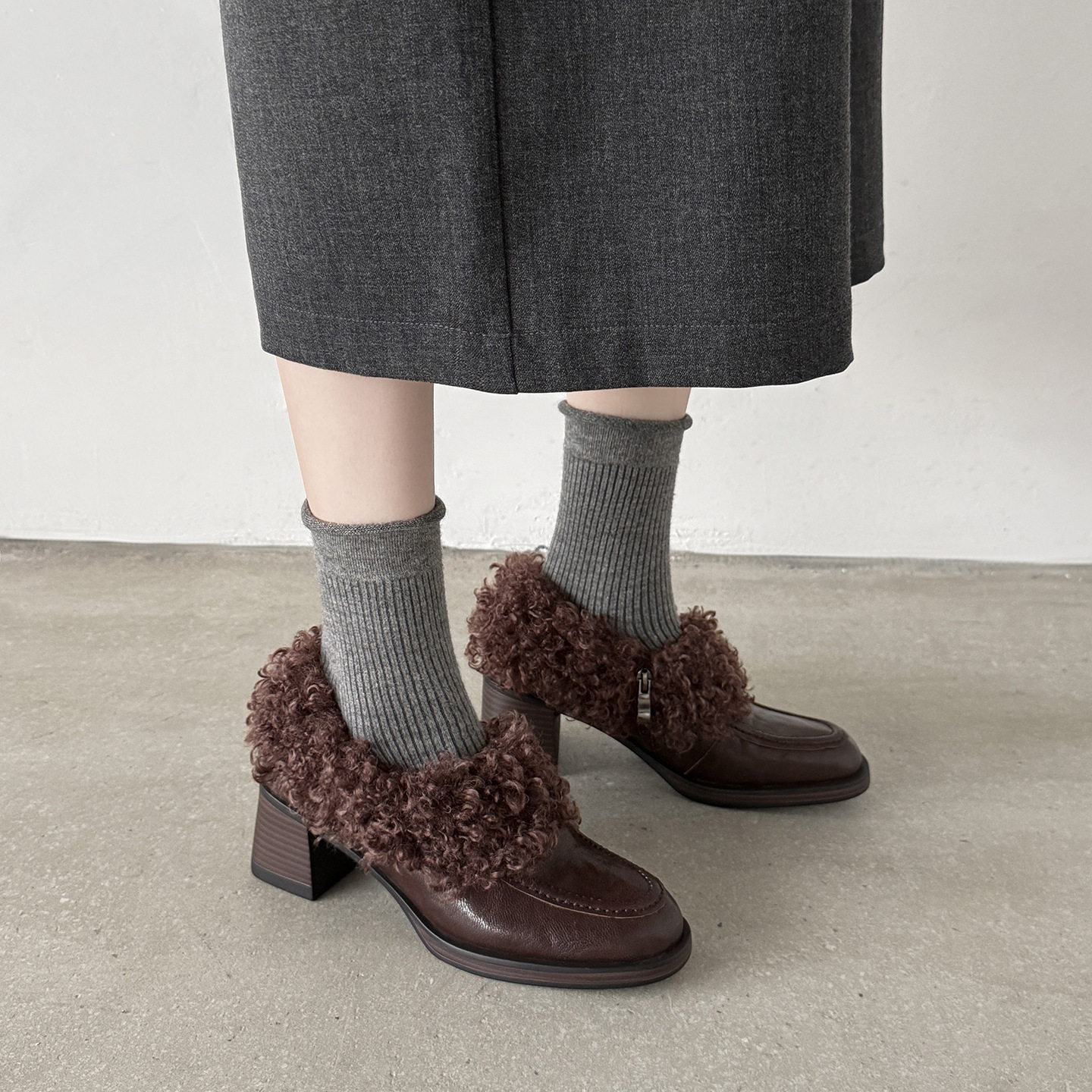 女士小皮鞋时尚2025年秋冬圆头粗跟中跟乐福鞋毛毛气质深口单鞋子
