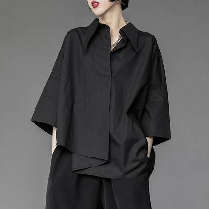 新款大码bf风不规则宽松衬衫女七分袖上衣夏季百搭懒惰风胖MM衬衣