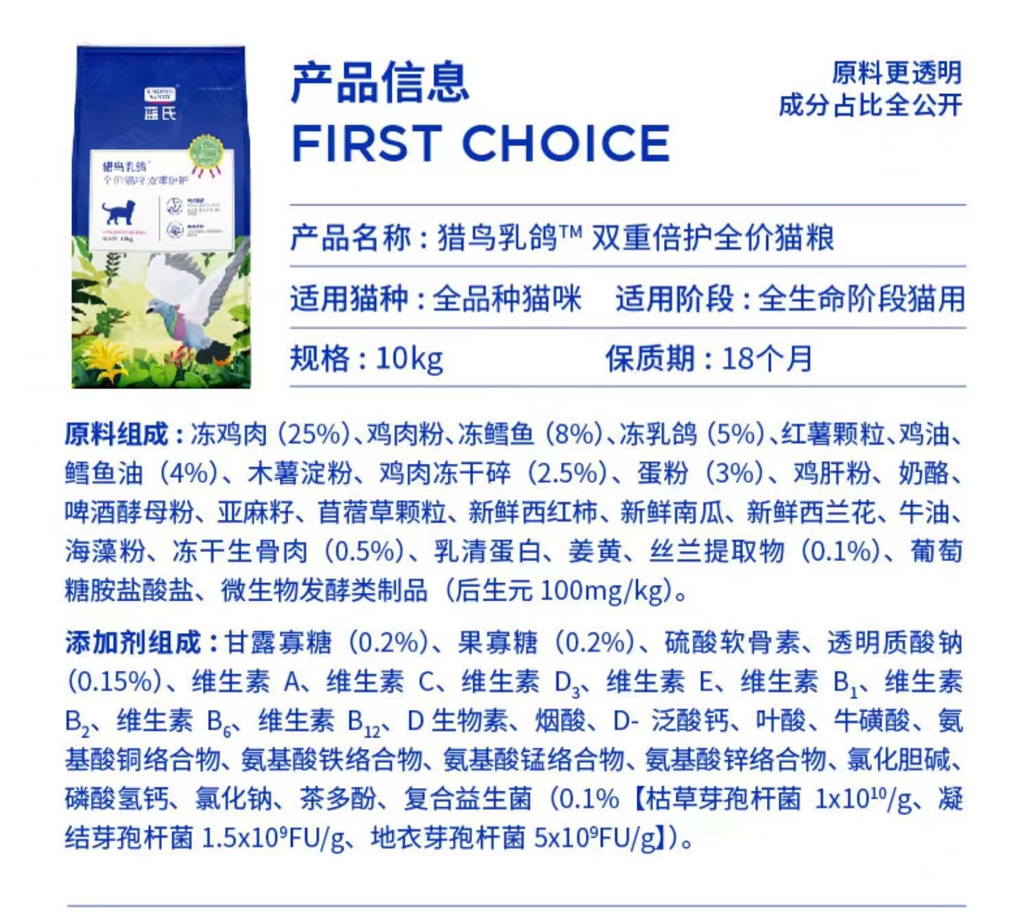 蓝氏猎鸟乳鸽全价繁育粮猫粮10kg官方猎兔冻干粮蓝式幼猫粮10公斤
