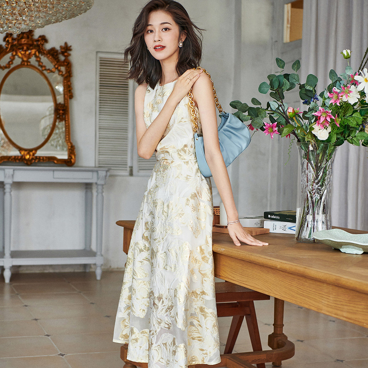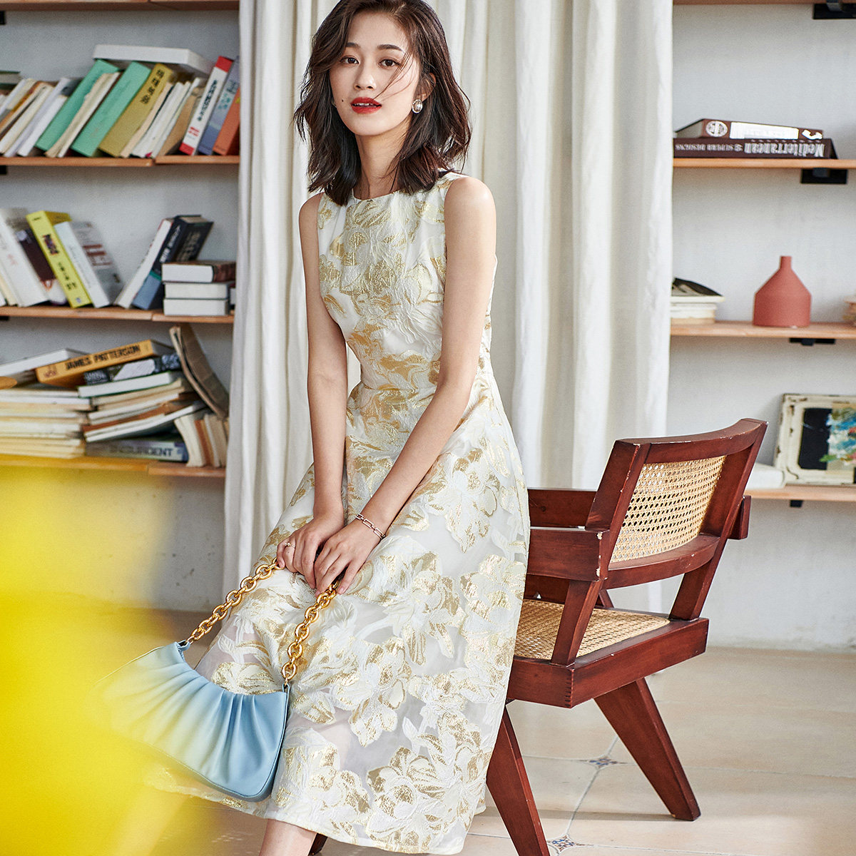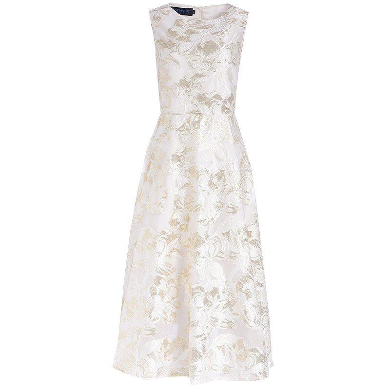 秋季温柔风显白复古真丝手感雪纺提花连衣裙赫本女神金色礼服裙子