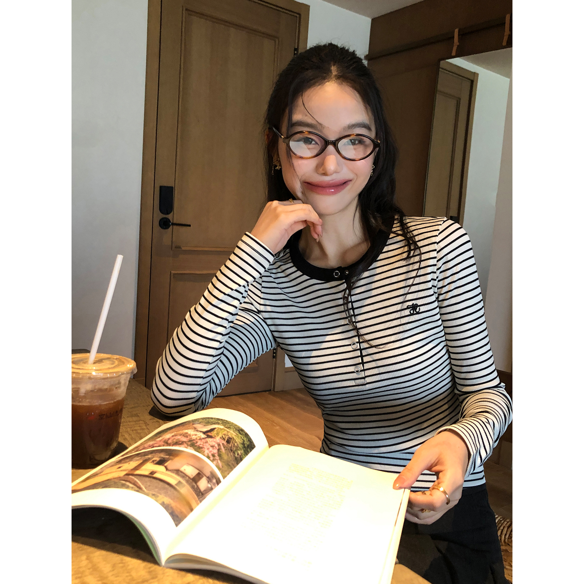 pusumede 布朗日志 条纹圆领长袖打底衫上衣女刺绣修身针织t恤