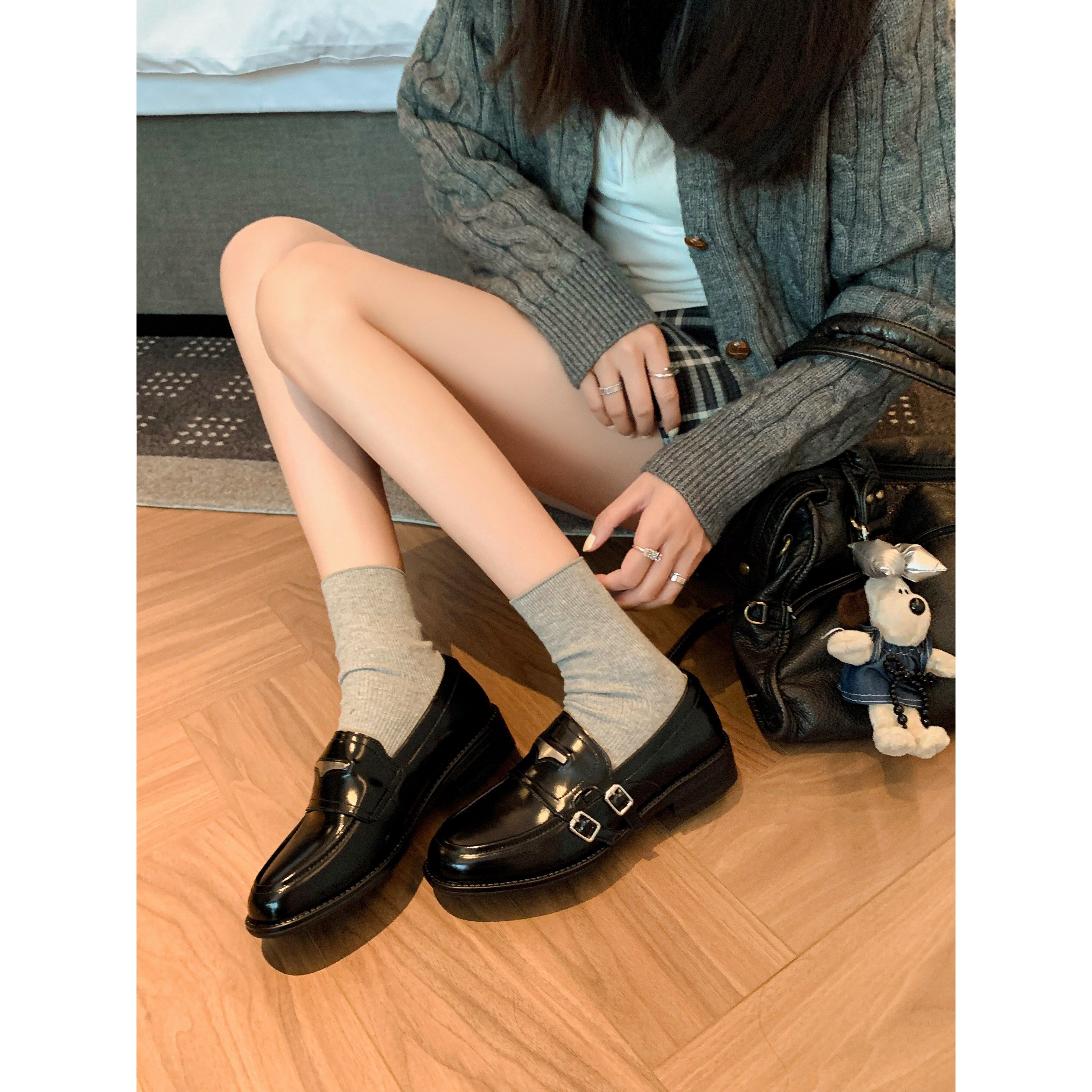 2026春季复古加绒粗跟乐福鞋女金属扣一脚蹬懒人真皮小皮鞋英伦风