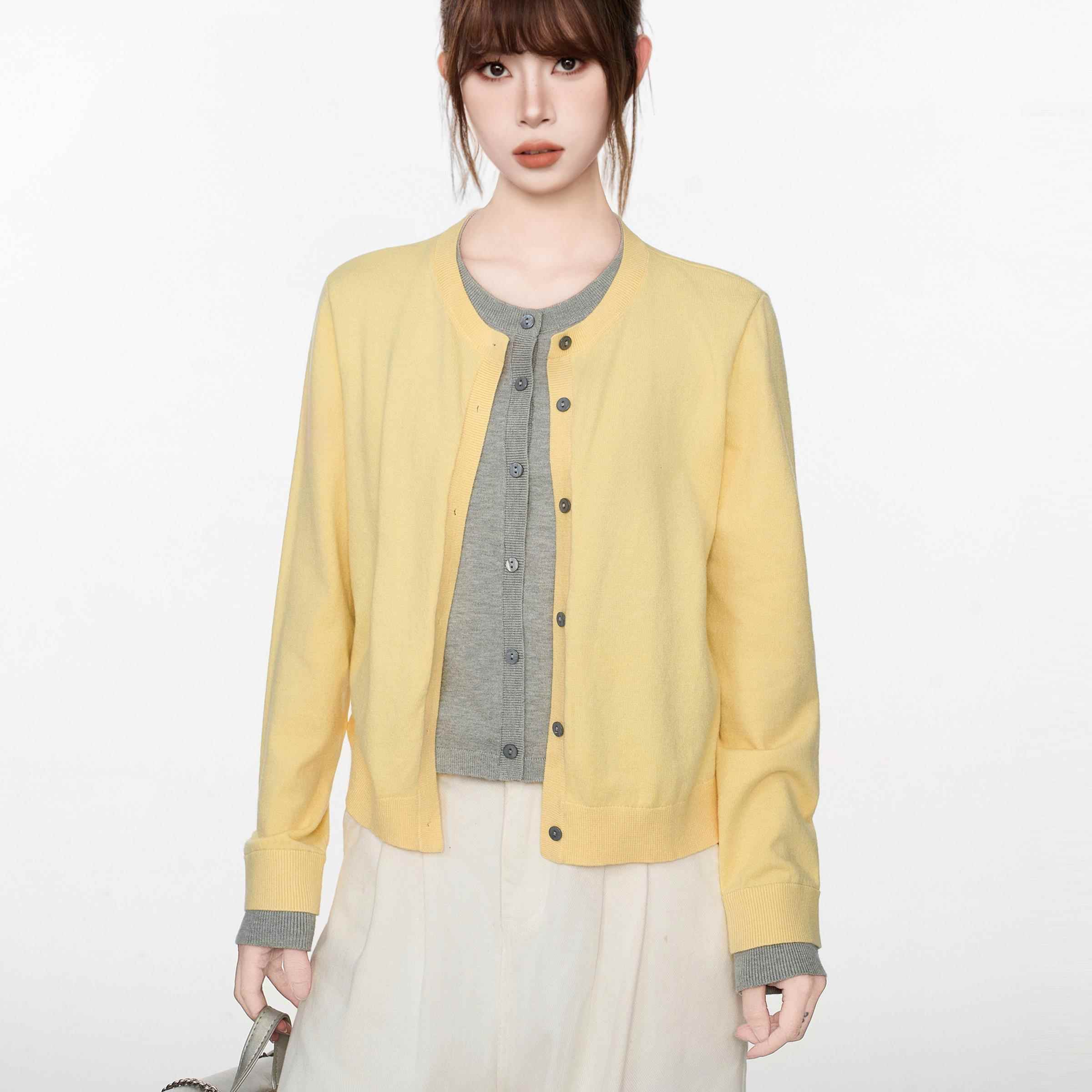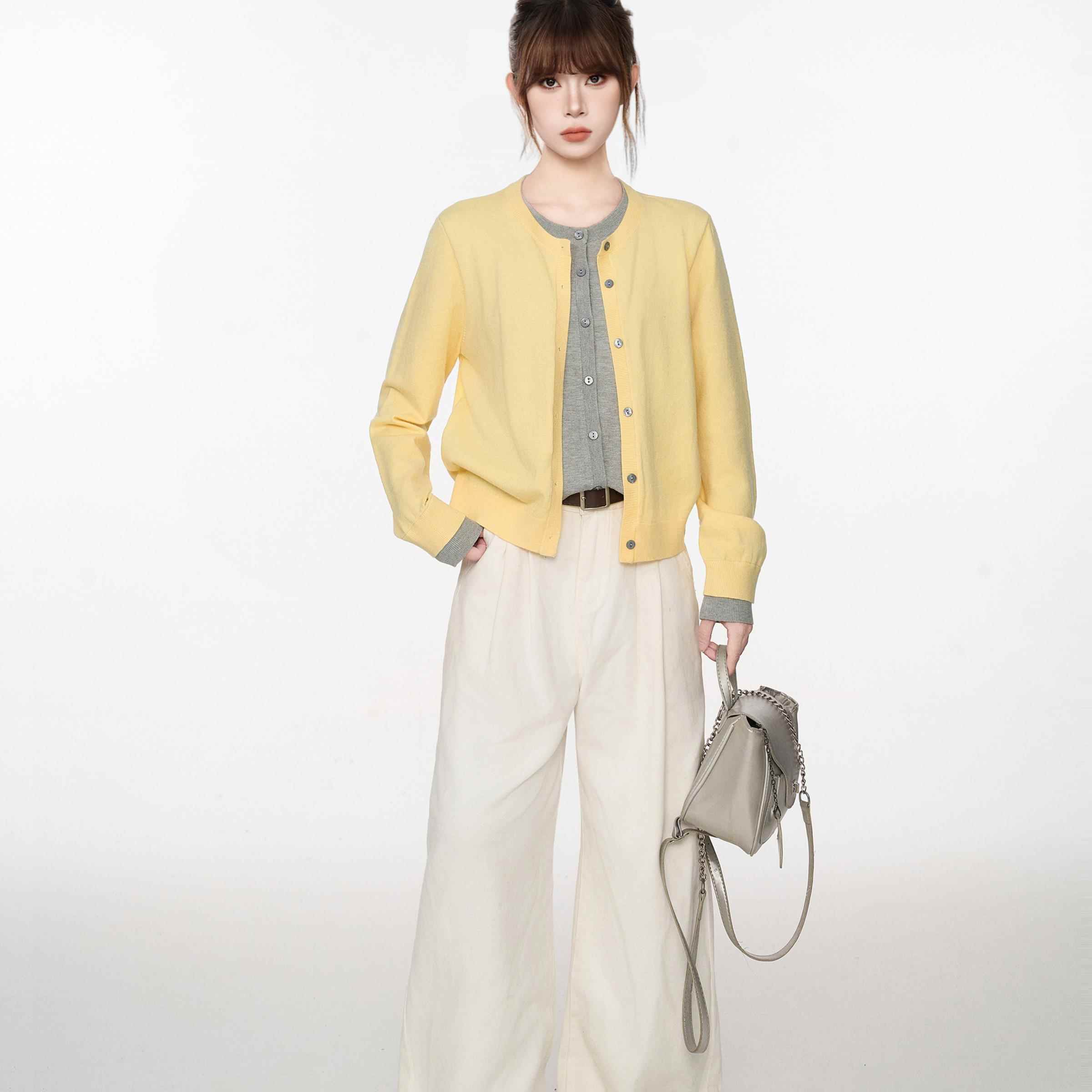 黄色假两件拼接长袖针织开衫女秋季2025新款短款外搭毛衣外套上衣