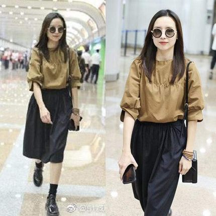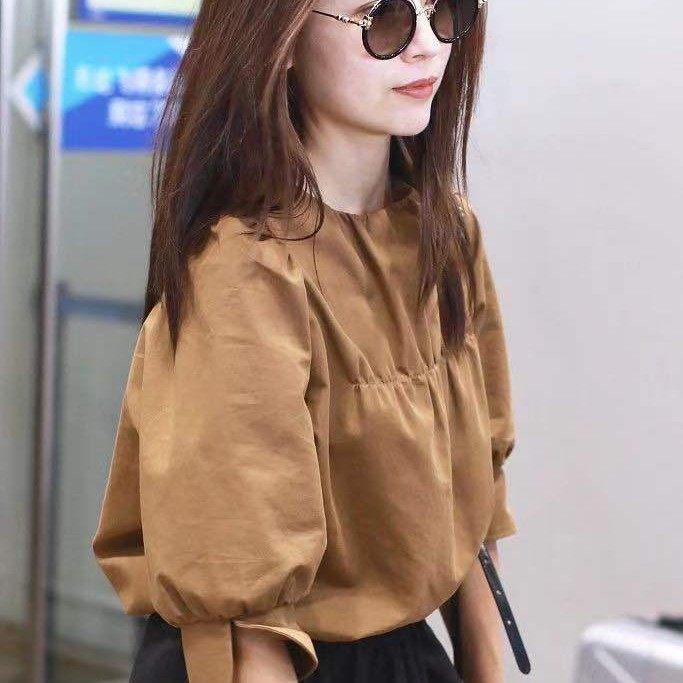 2024年秋季欧洲明星董洁同款棕色宽松衬衫新款高腰黑色A字裙套装