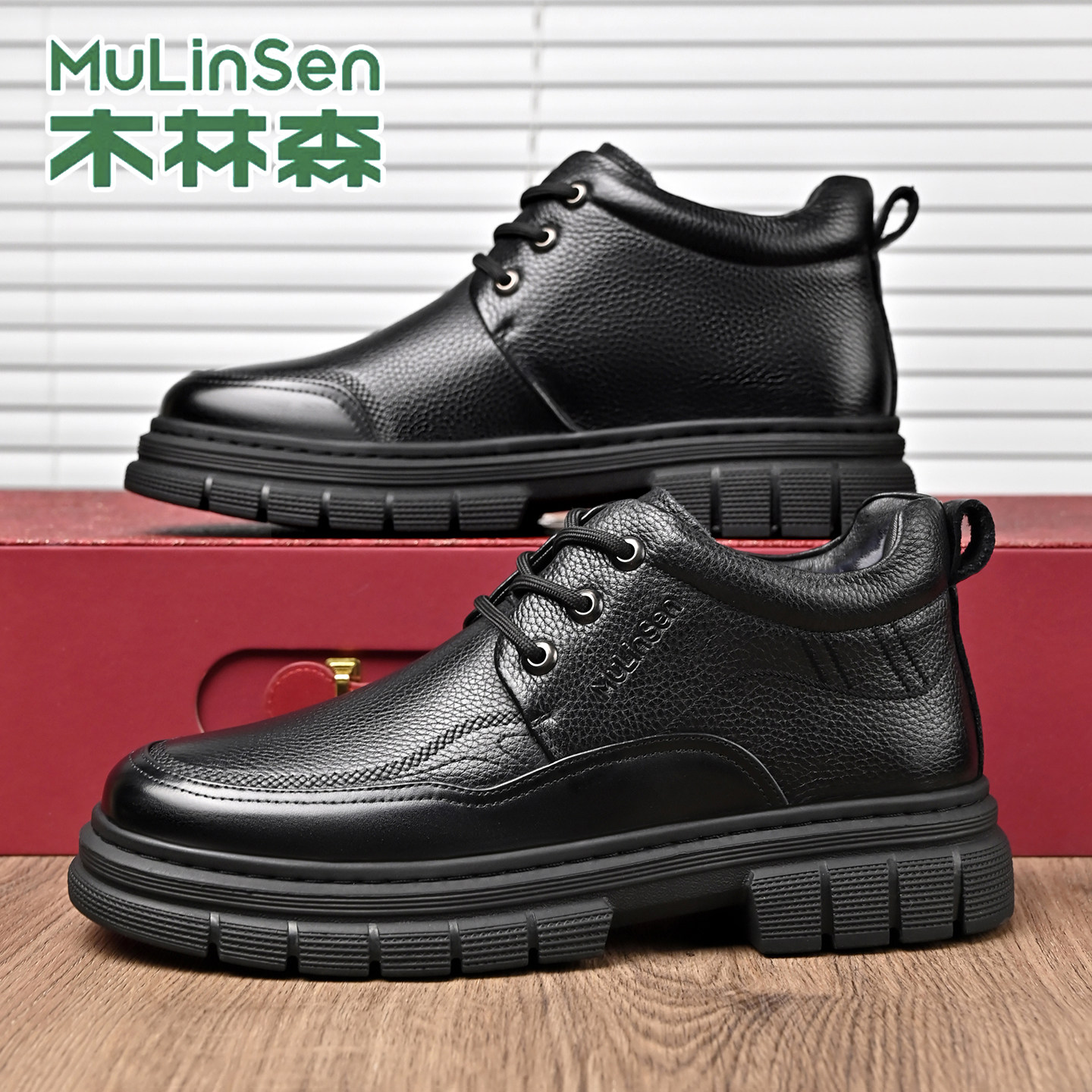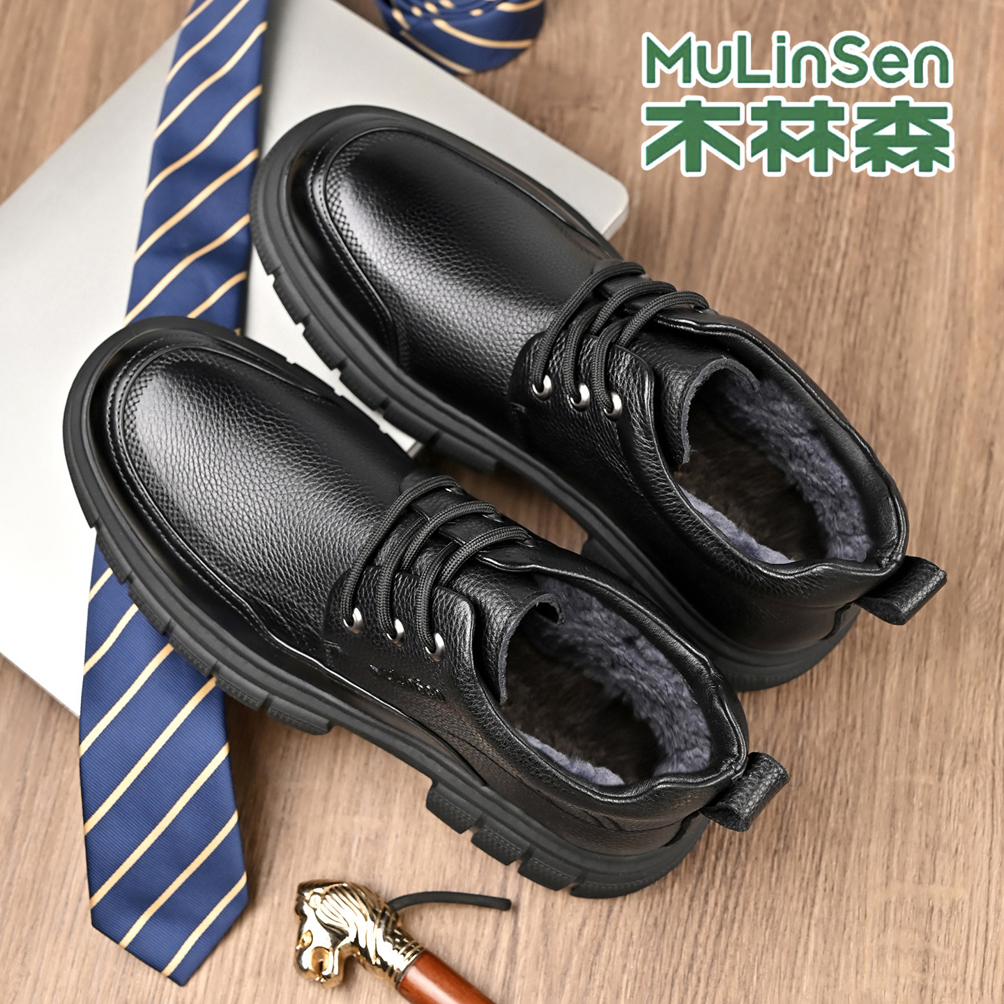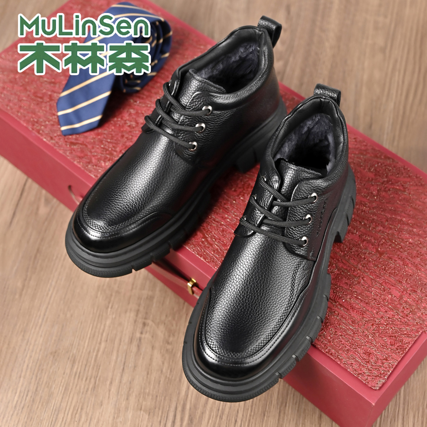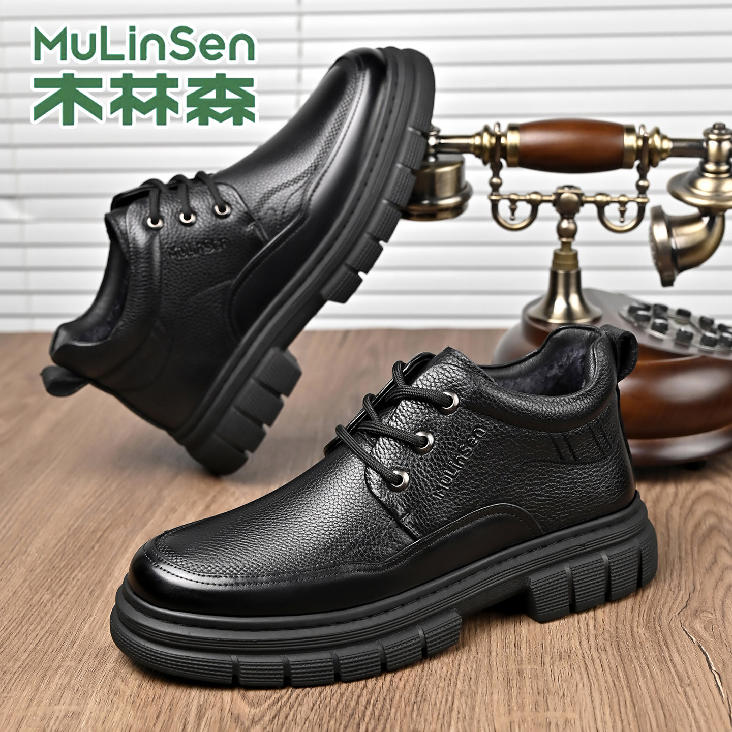 木林森男鞋厚底男士休闲皮鞋冬季加绒保暖黑色系带百搭商务休闲鞋