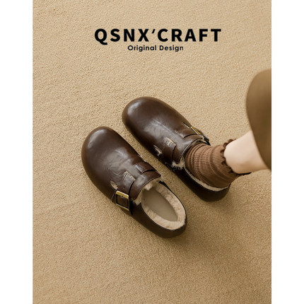 真皮~加绒皮面勃肯鞋女2025新款冬季单鞋保暖毛毛棉鞋棕色小皮鞋