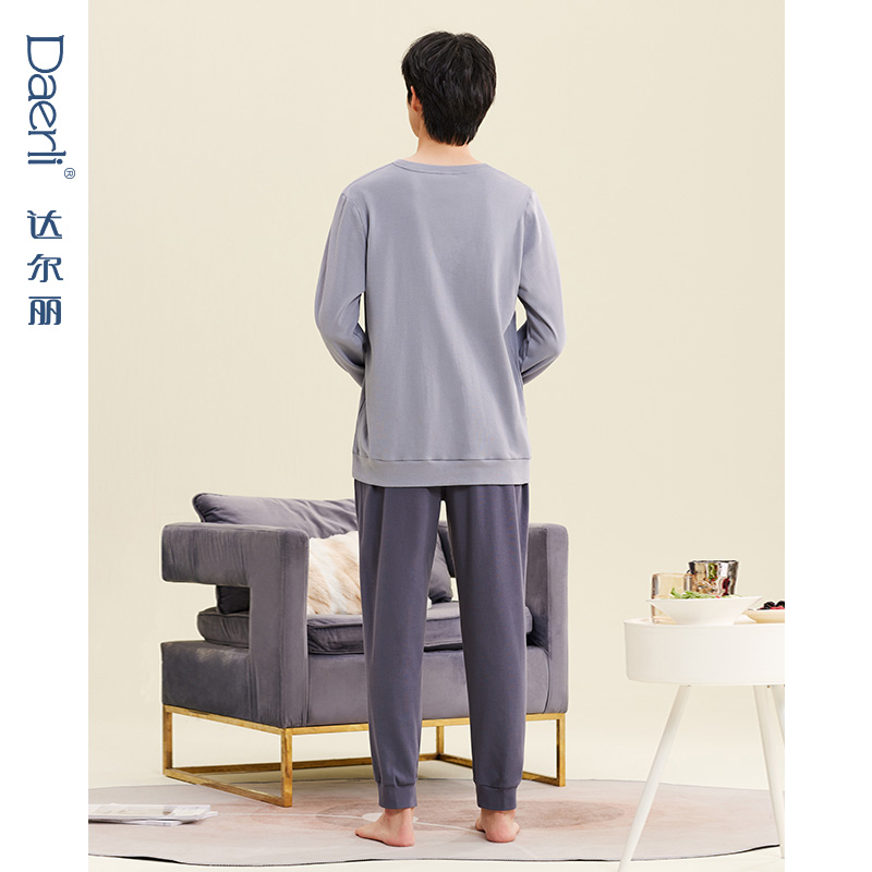 达尔丽纯棉圆领套头睡衣男款春秋款长袖简约纯色男士家居服套装薄
