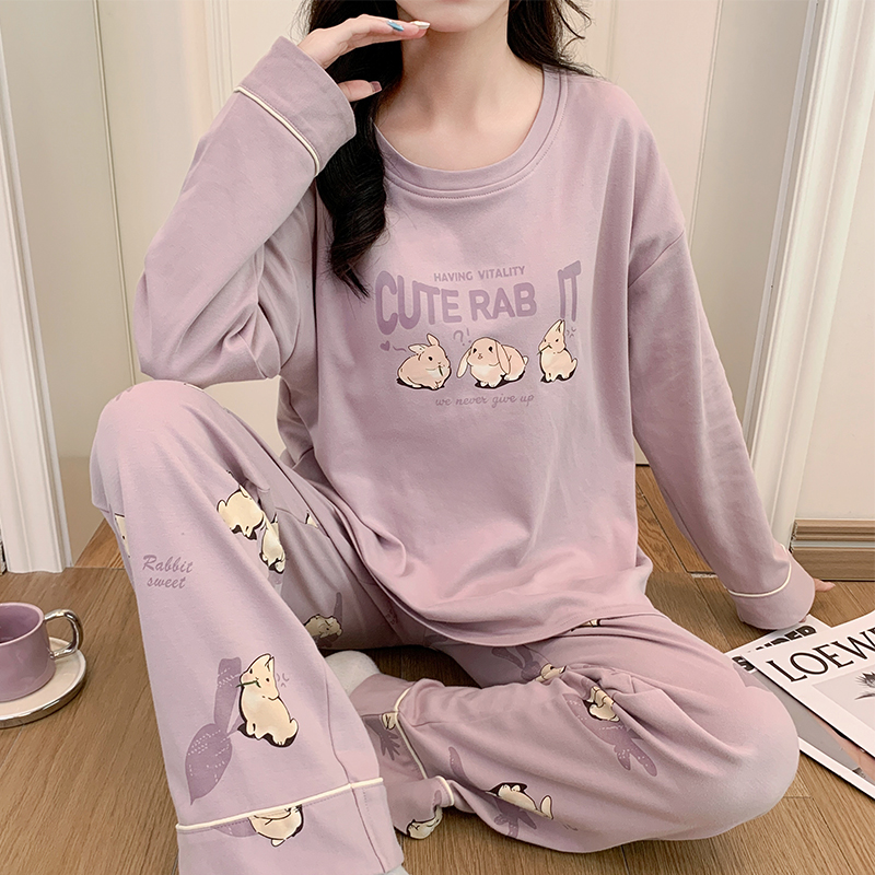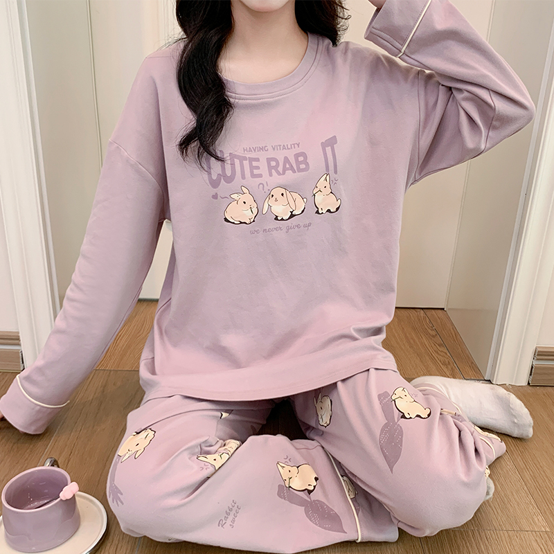 蓓蓓可睡衣带胸垫一体长袖春秋季纯棉少女可爱卡通兔子印花家居服