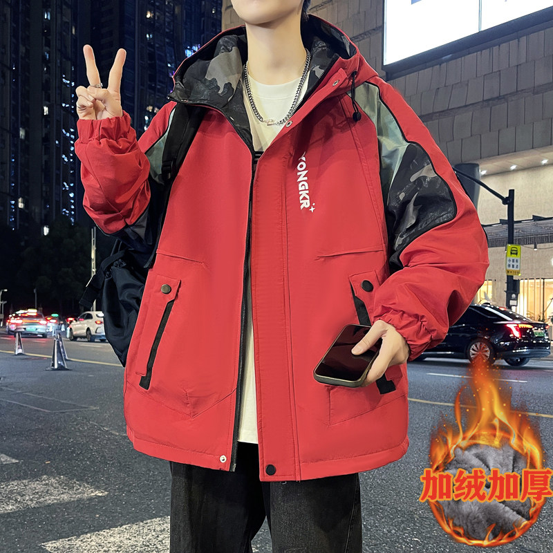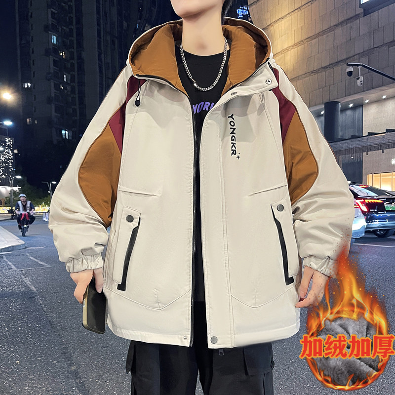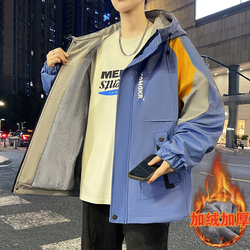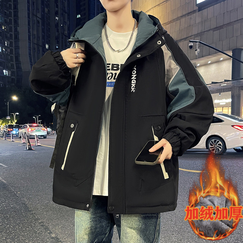 啄木鸟秋冬季加厚外套男青少年连帽加绒夹克时尚港风潮流冲锋衣服