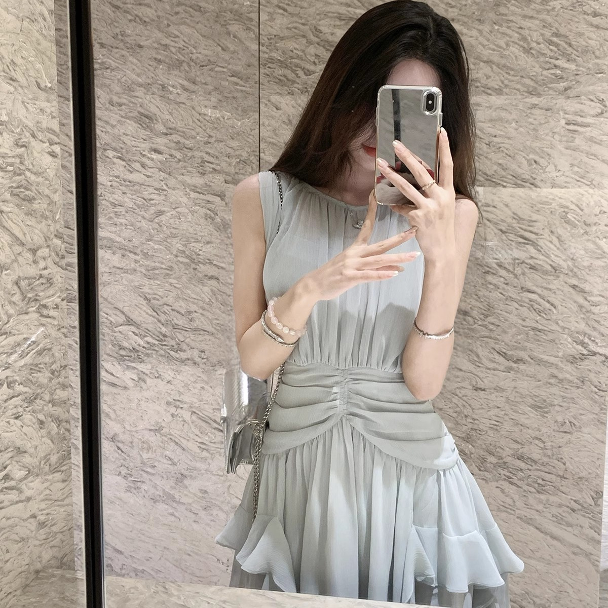秋季女收腰雪纺裙子洋气2025新款休闲纯色时尚风短裙连衣裙女气质
