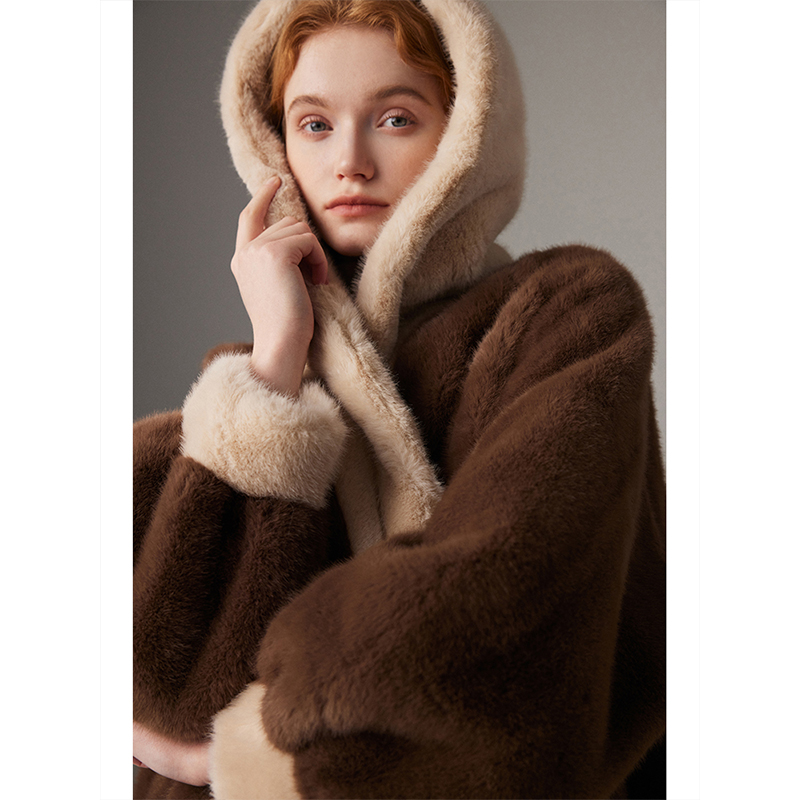 水貂绒环保仿皮草外套女休闲连帽撞色年轻款2025新款皮毛一体大衣
