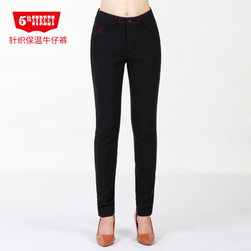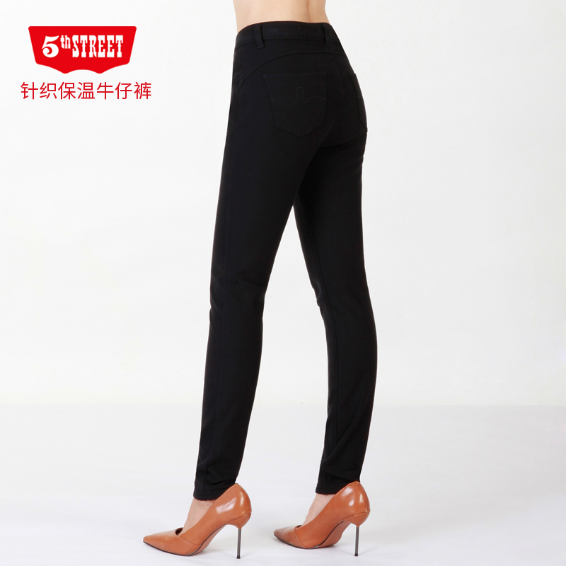 第五街加绒加厚小脚牛仔裤女冬季保暖弹力针织长裤114860-204M0