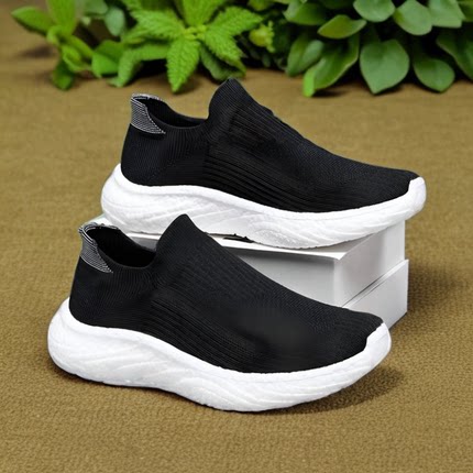 春秋一脚蹬黑色飞织运动跑步鞋休闲百搭轻便爆米花遛弯鞋男女同款