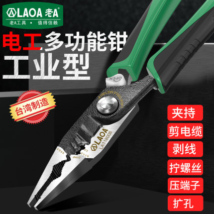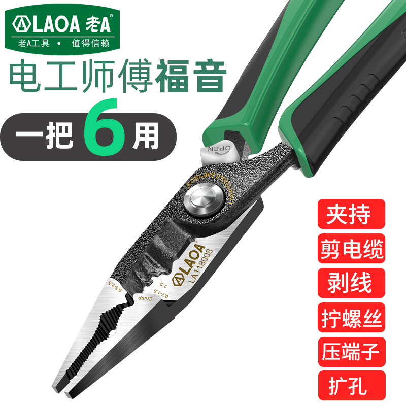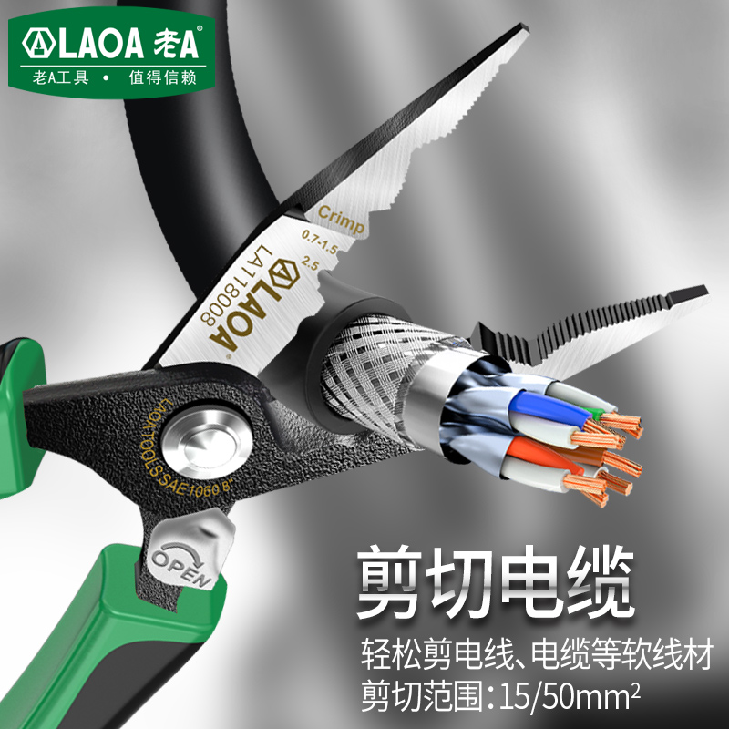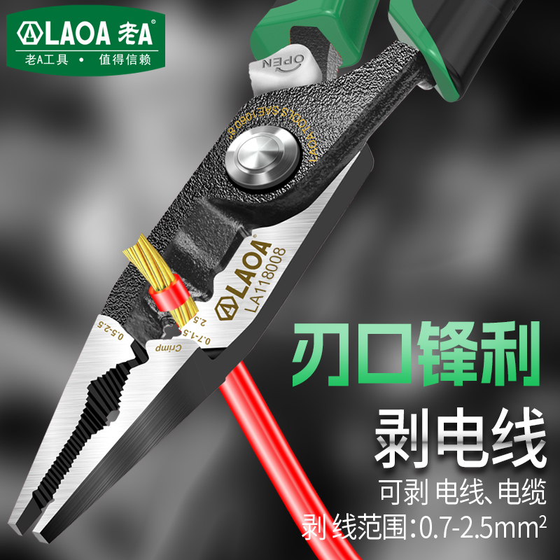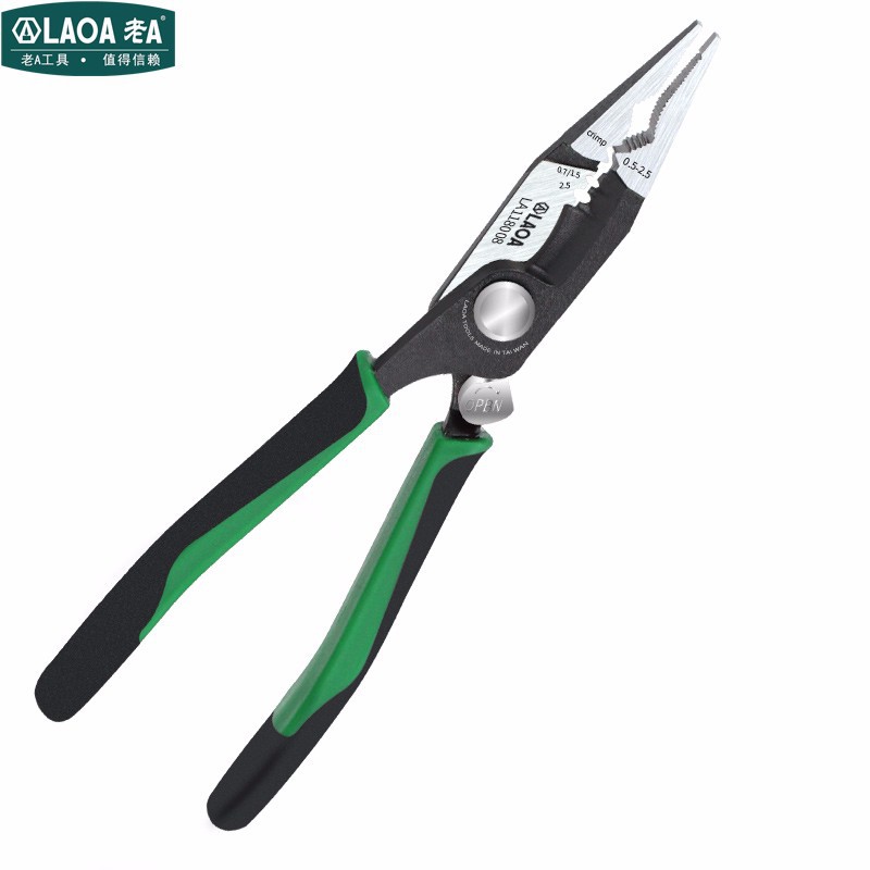 老A 台湾8寸尖嘴钳 多功能电缆剪剥线钳5合1端子压接钳LA118008
