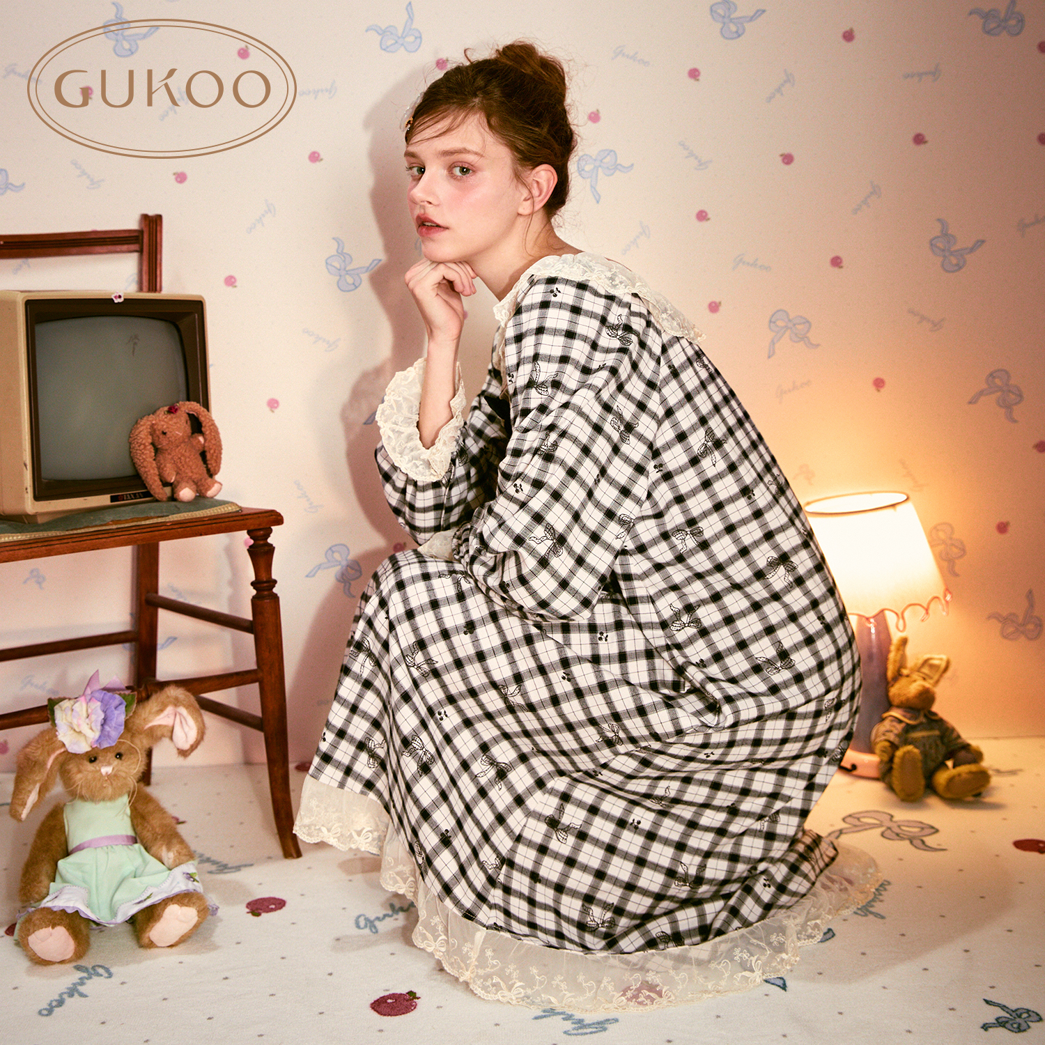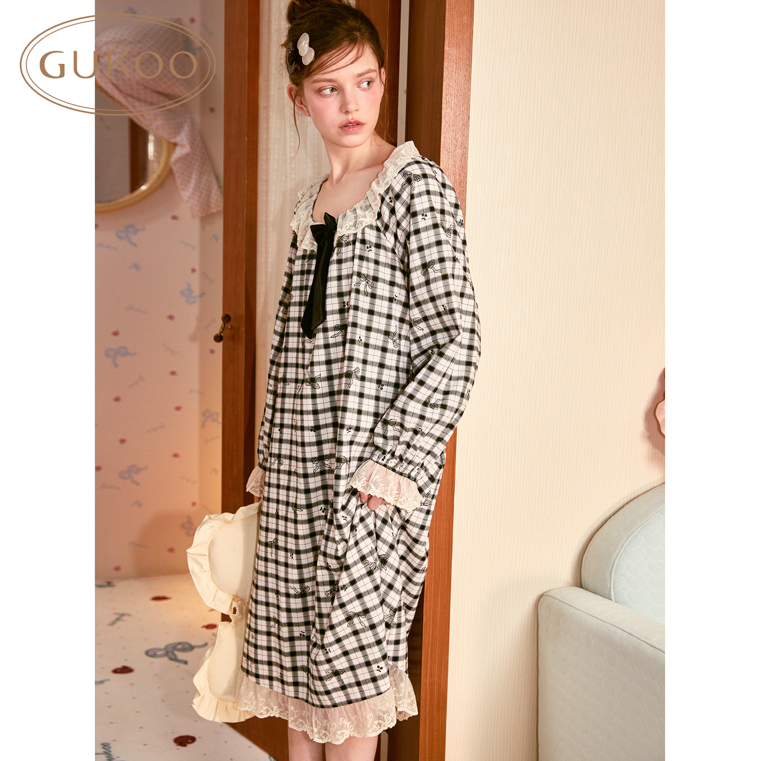 Gukoo/果壳睡裙女春秋款纯棉格子新款网纱边女士家居服睡裙C