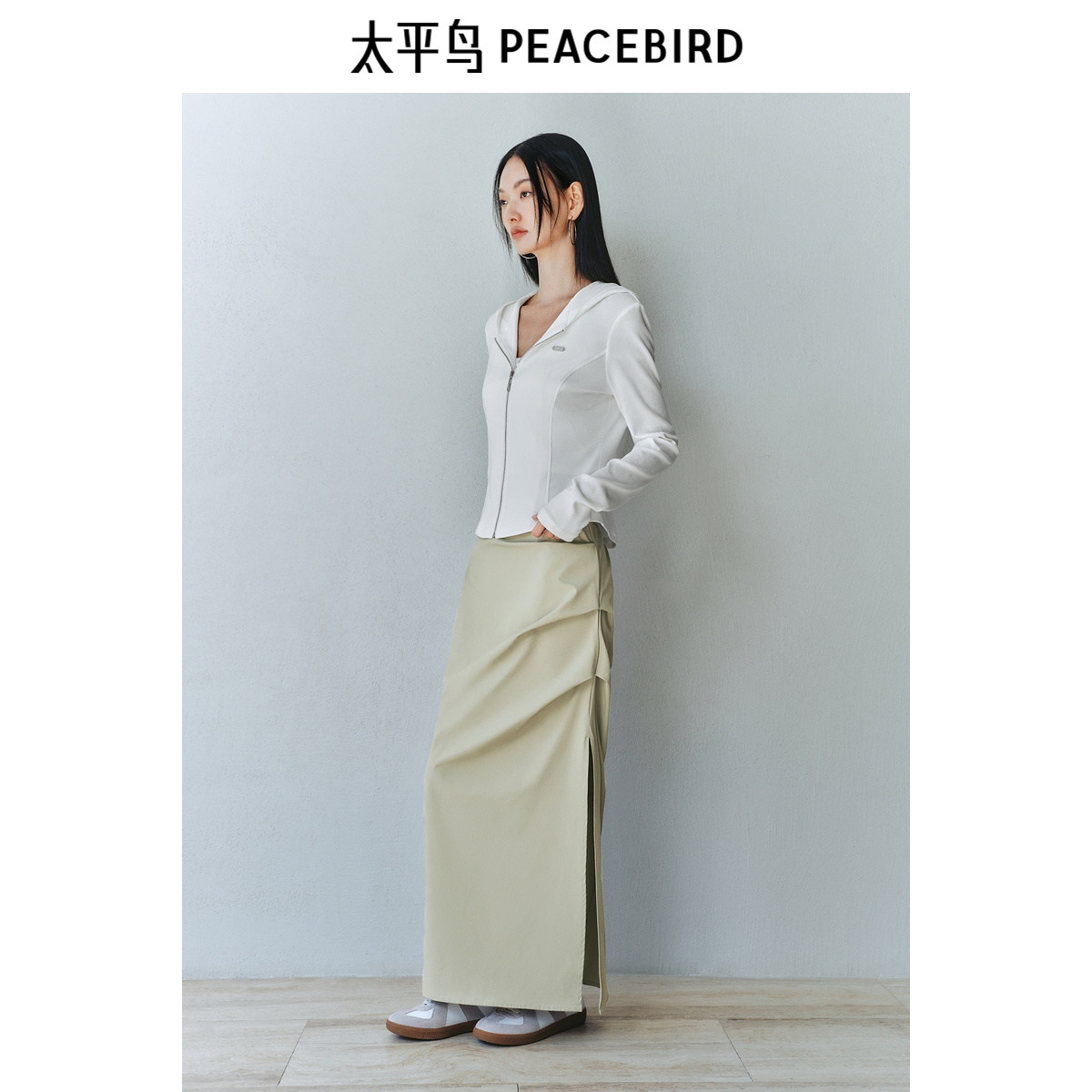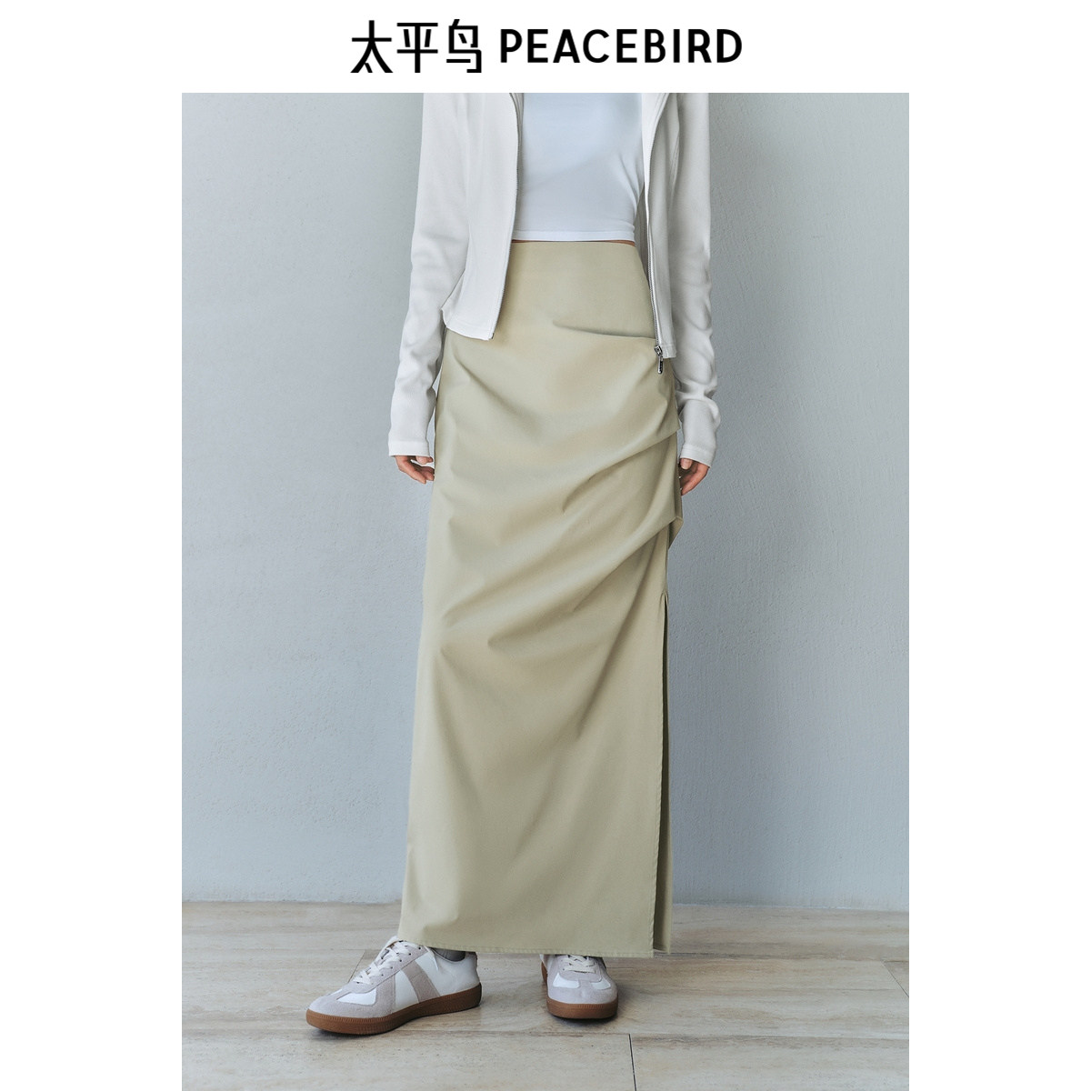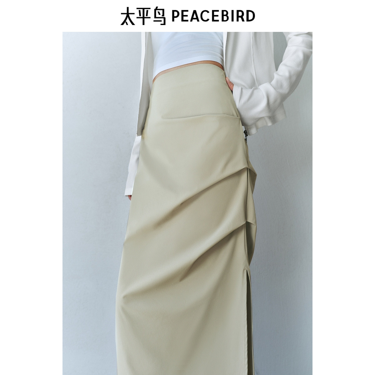 太平鸟压褶长裙女2025春款侧开叉直筒显瘦遮胯小众半身裙休闲时尚
