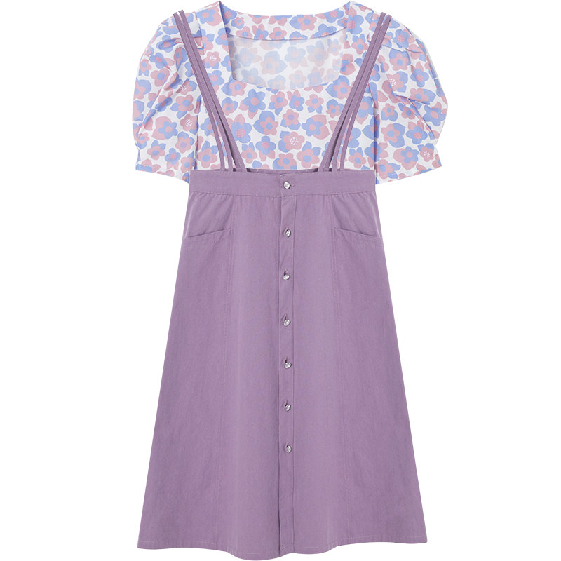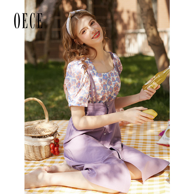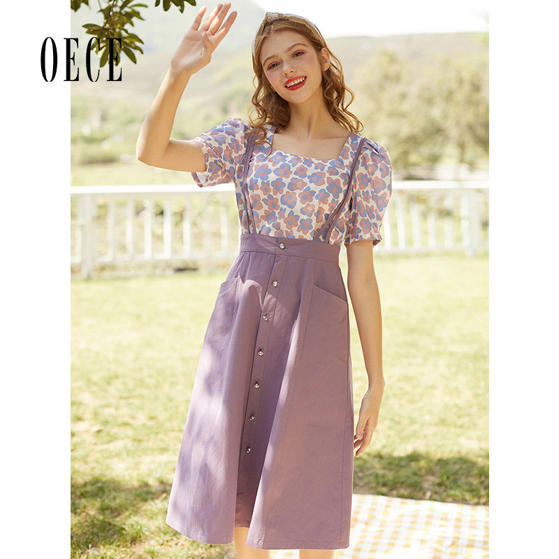 oece夏装新款女装元气紫色小碎花复古泡泡袖上衣背带裙套装