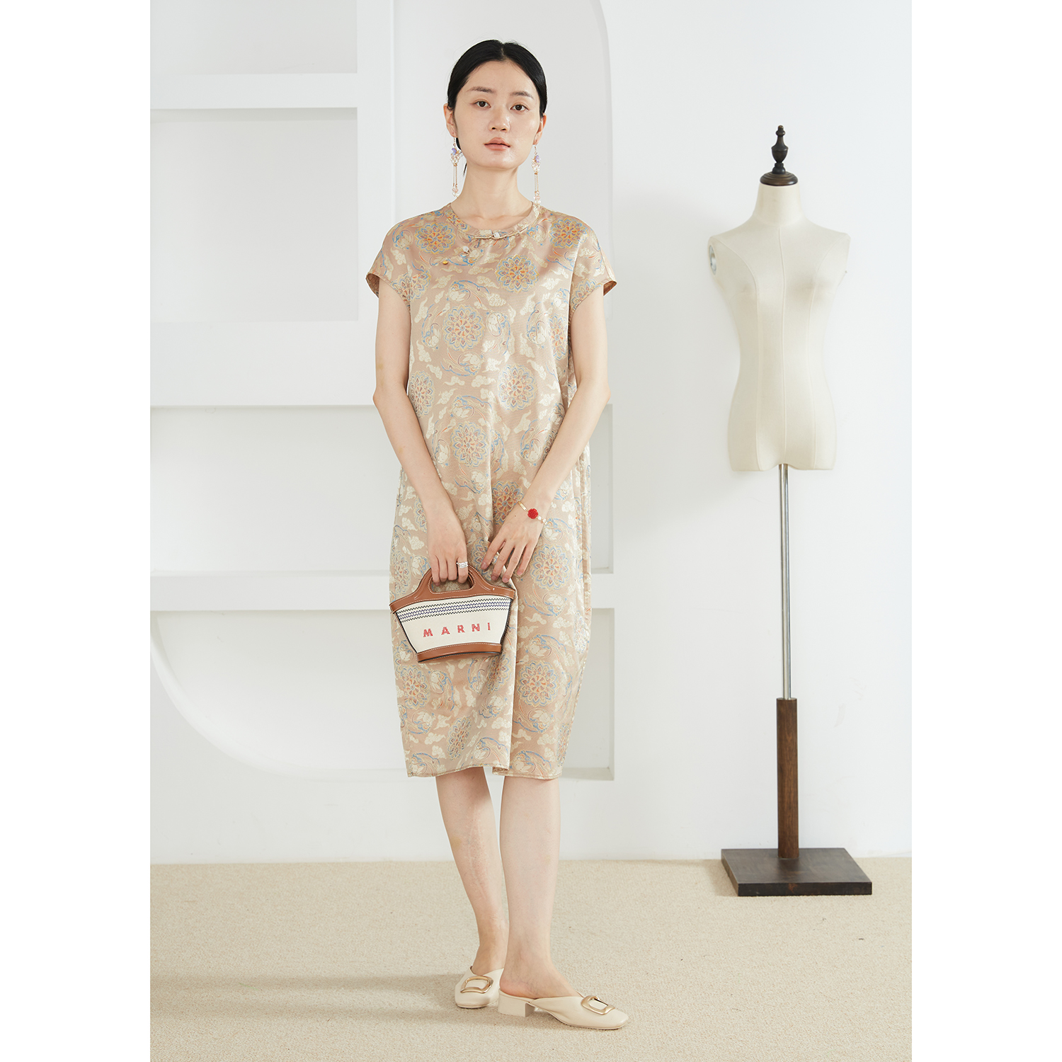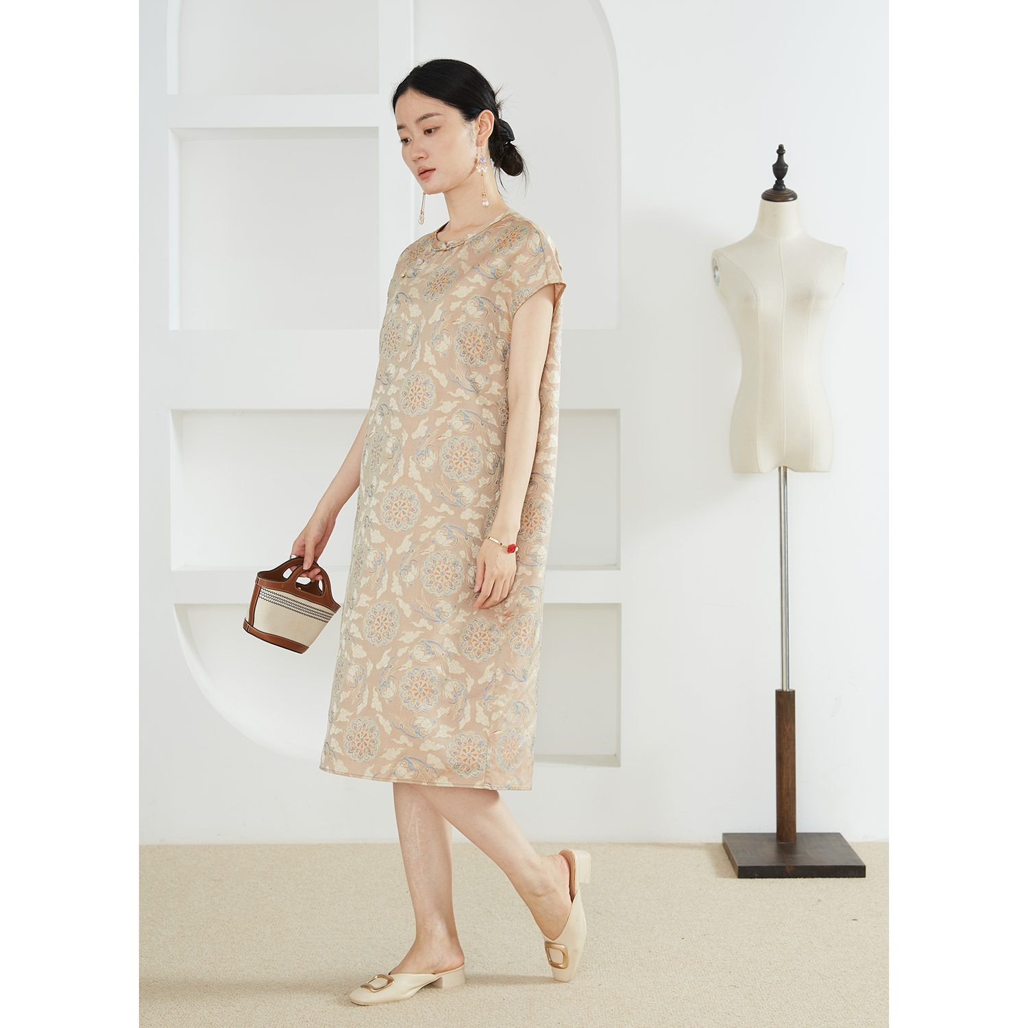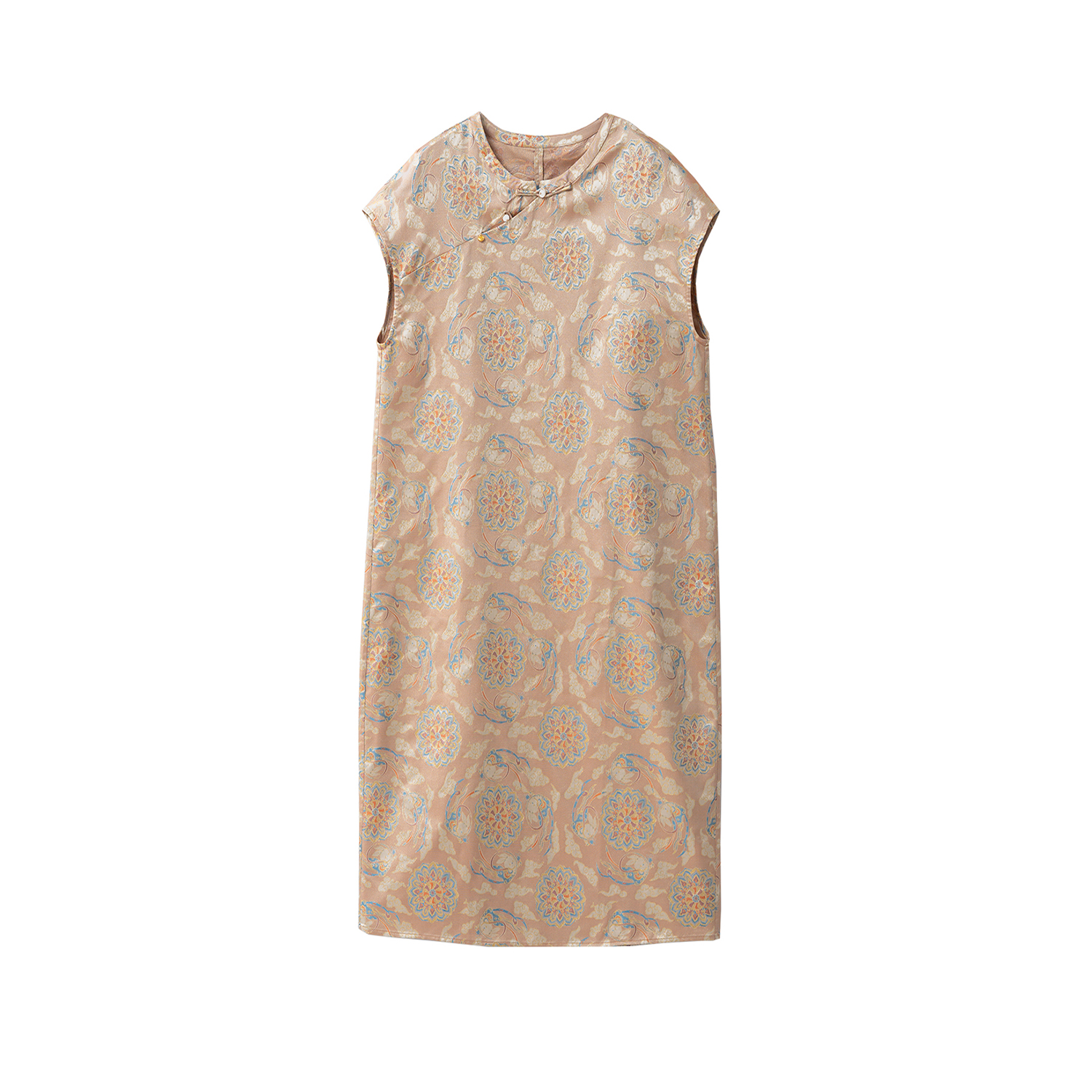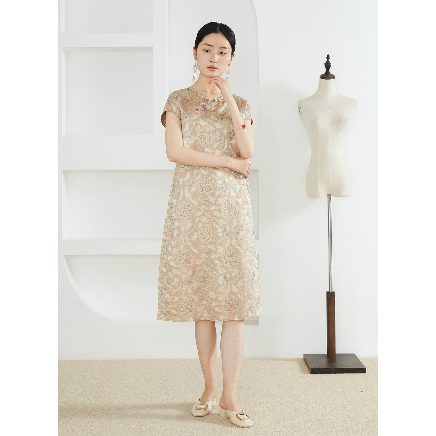 一丝牵敦煌飞兔金丝线提花100%桑蚕丝真丝异色罗长款新中式连衣裙