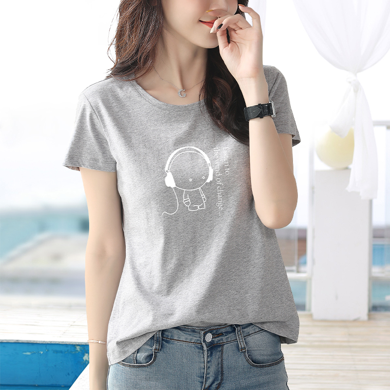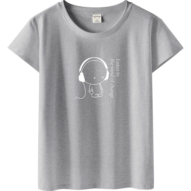 灰色大码显瘦上衣女遮肉修身卡通印花t恤简约纯棉圆领短袖女装夏