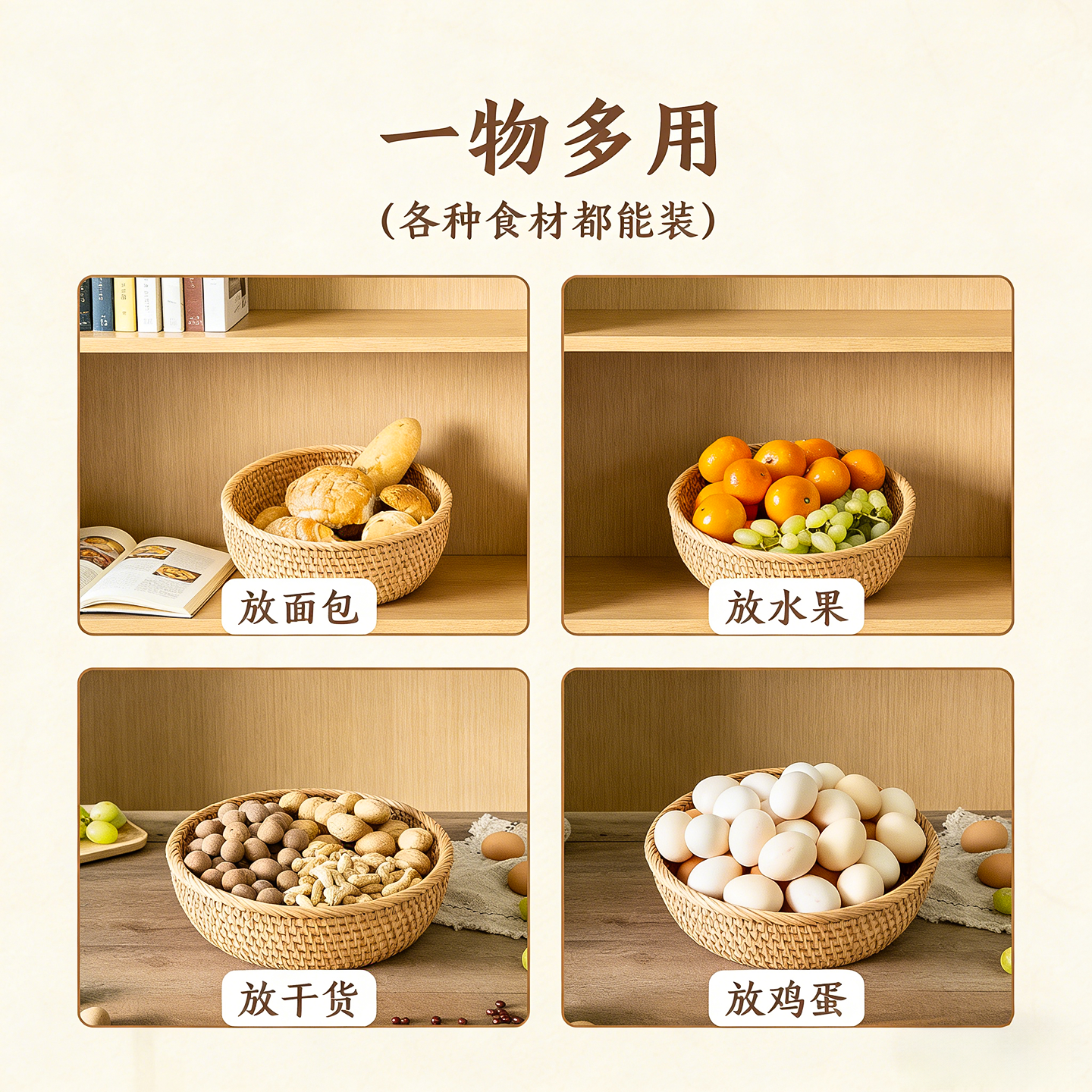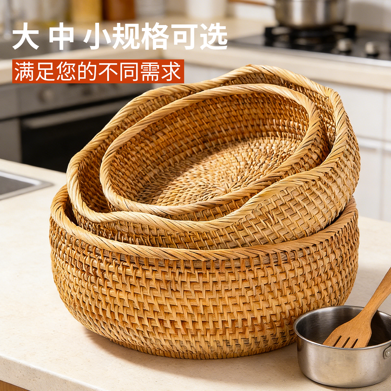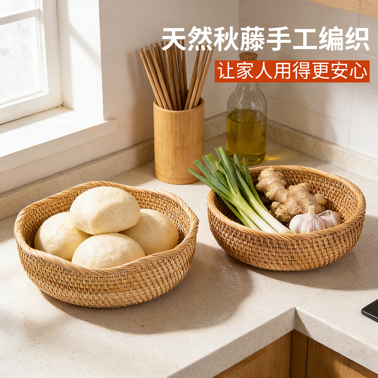 手工藤编馒头筐子家用食品级放馍筐子点心水果圆形托盘鸡蛋收纳筐