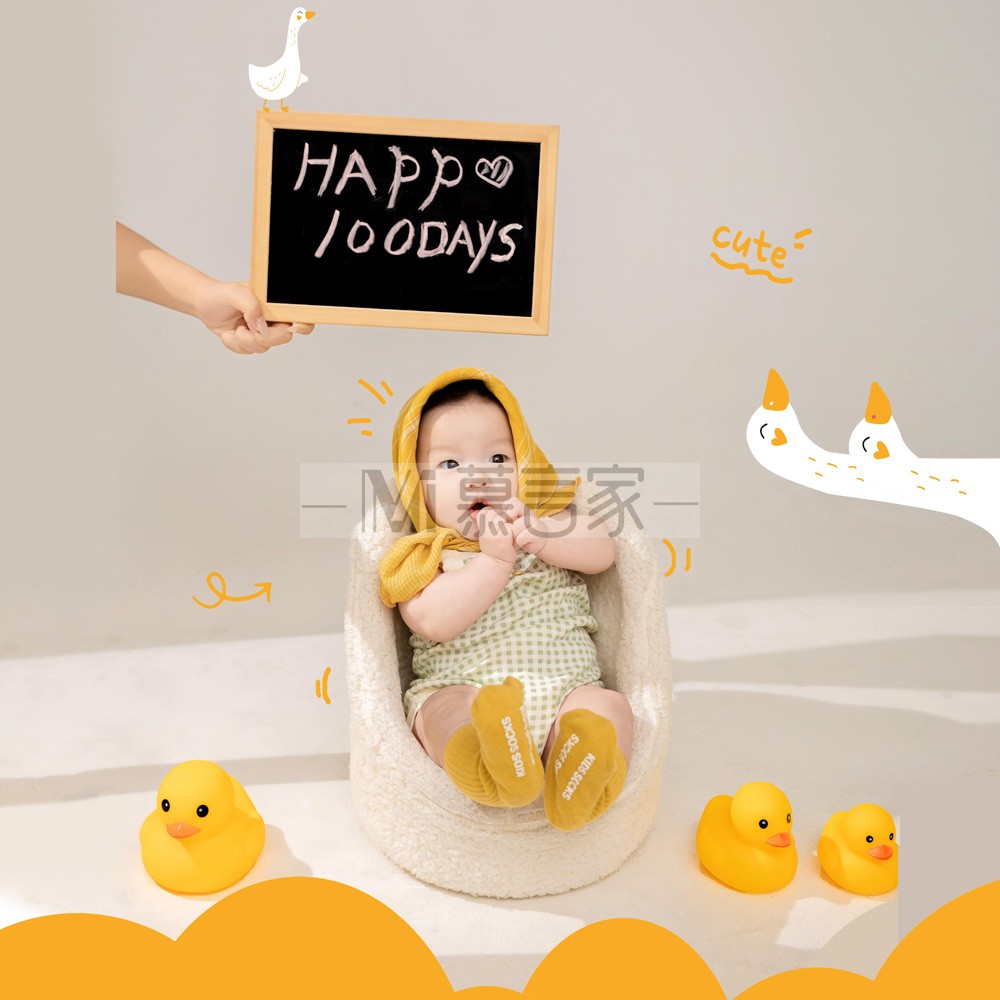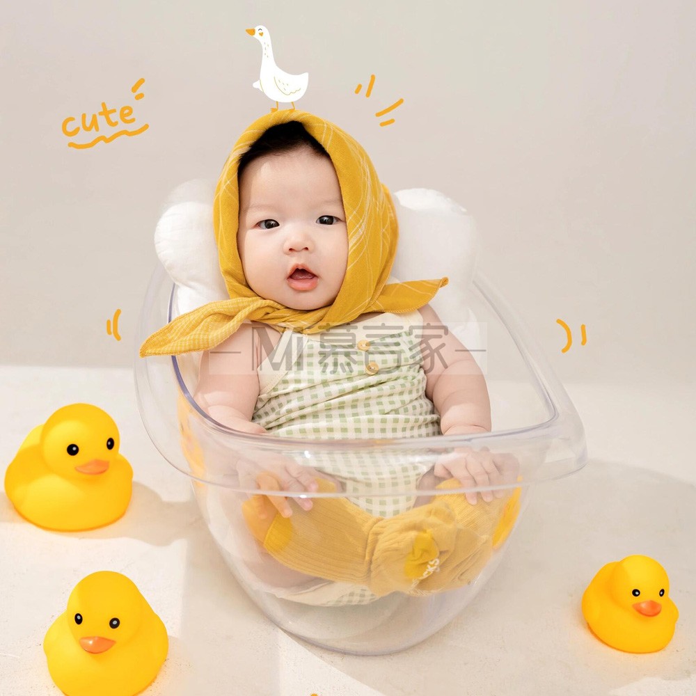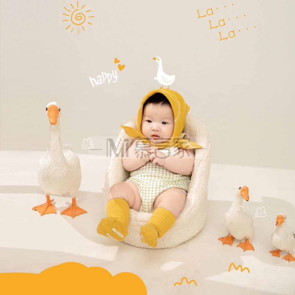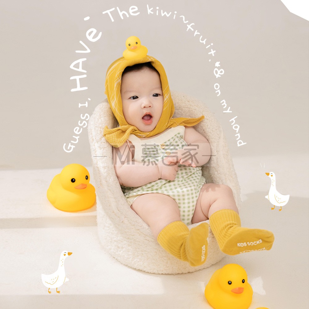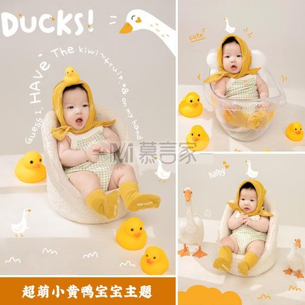 卡通黄色小鸭主题儿童摄影服装影楼百天宝宝格子哈衣套装写真