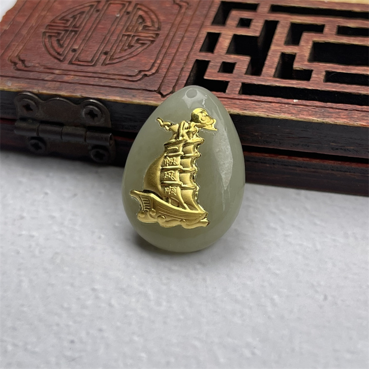 黄金足金镶嵌天然和田玉金镶玉一帆风顺帆船项链玉石吊坠挂件男女