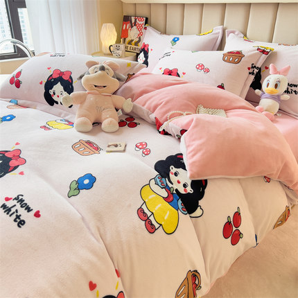 白雪公主牛奶绒床品四件套法兰绒床单床笠被套儿童卡通学生三件套