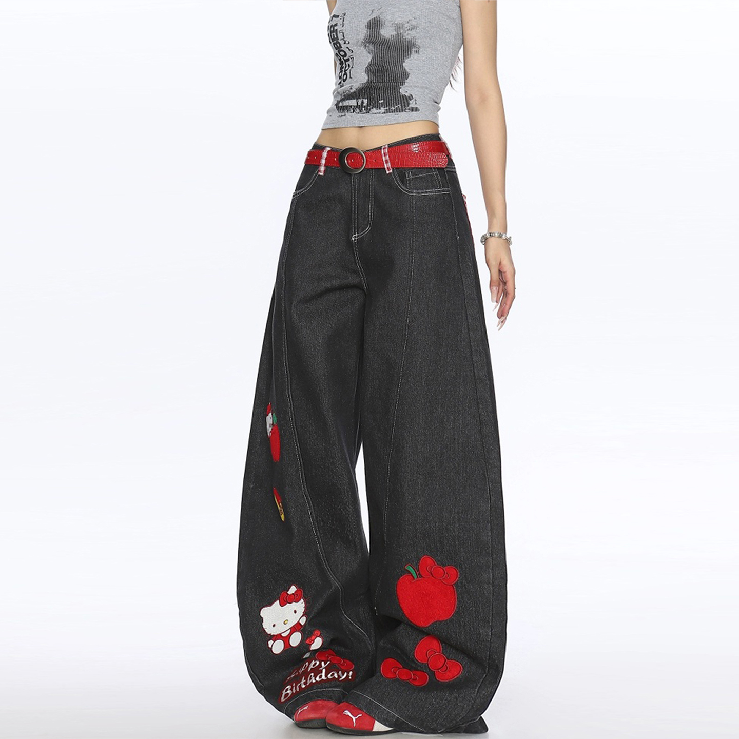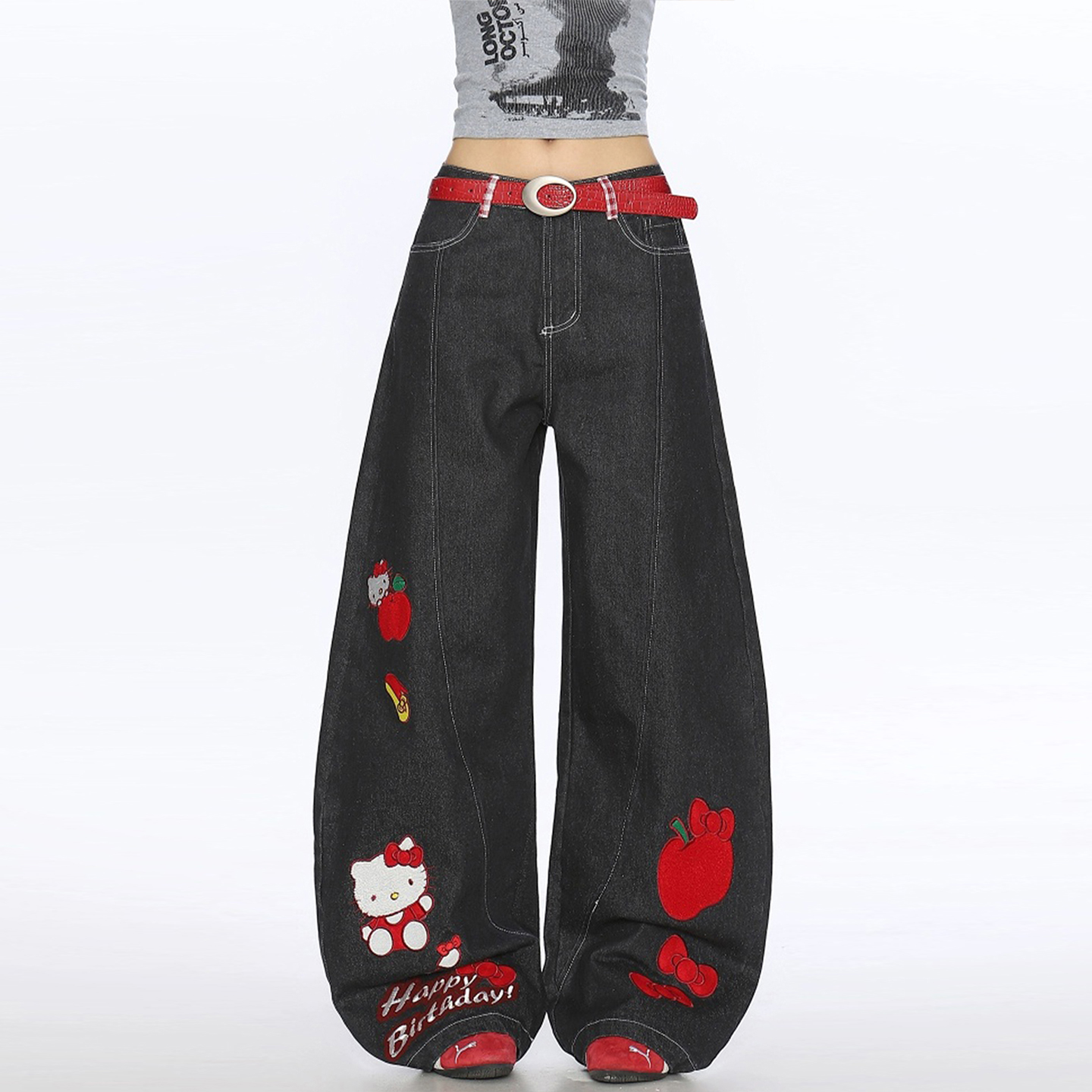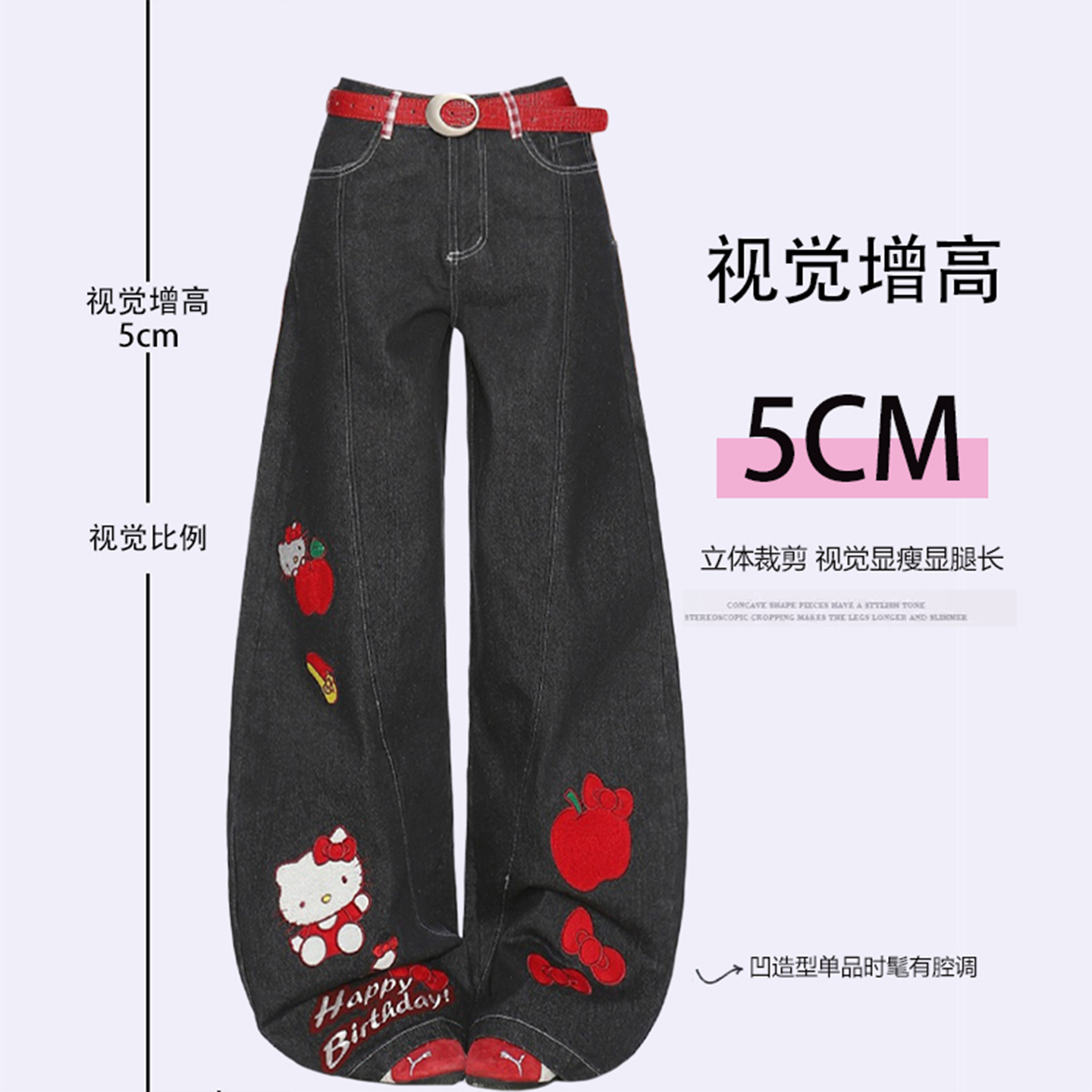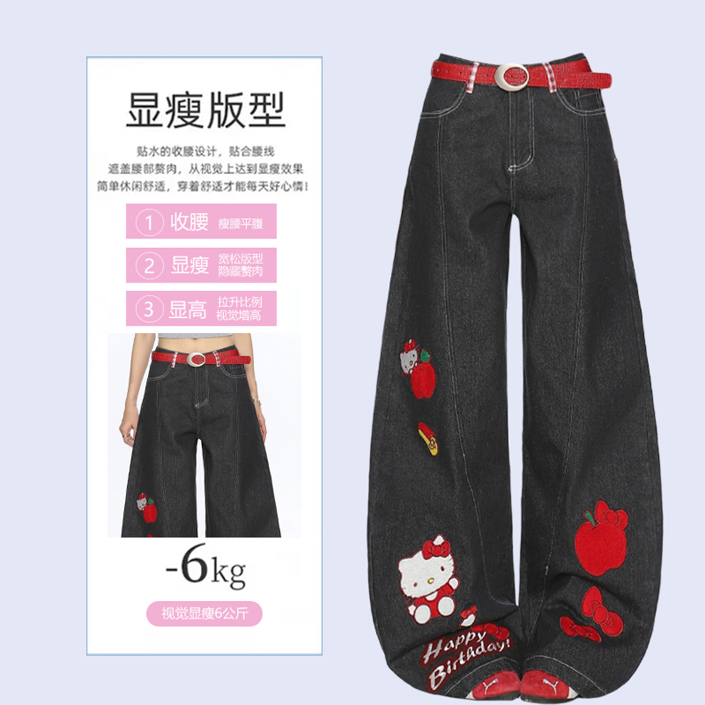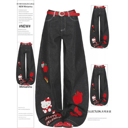 胖mm大码女装苹果kt刺绣牛仔裤女秋季设计感休闲百搭黑色阔腿裤子