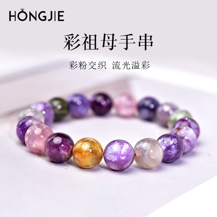 彩祖母晶手串一物一图东海水晶玛瑙玉石彩色宝石散珠子锂云母手链