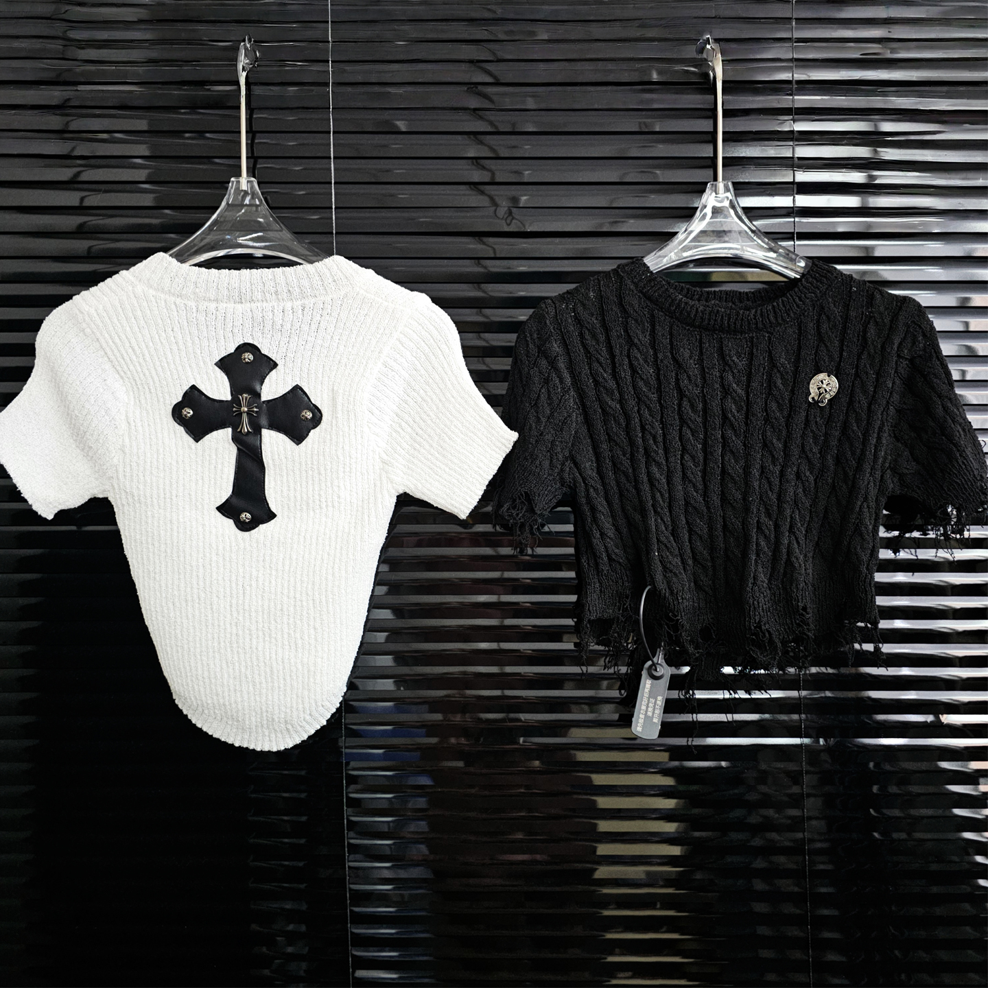 辣妹做旧撕破十字架刺绣贴布短袖针织衫女小个子修身显瘦T恤小衫