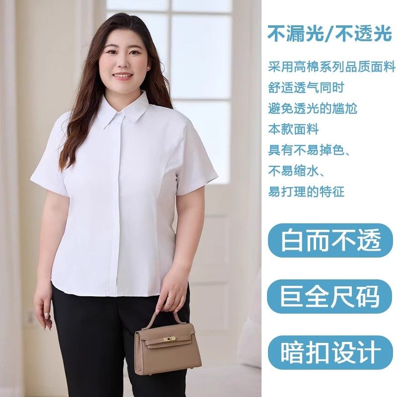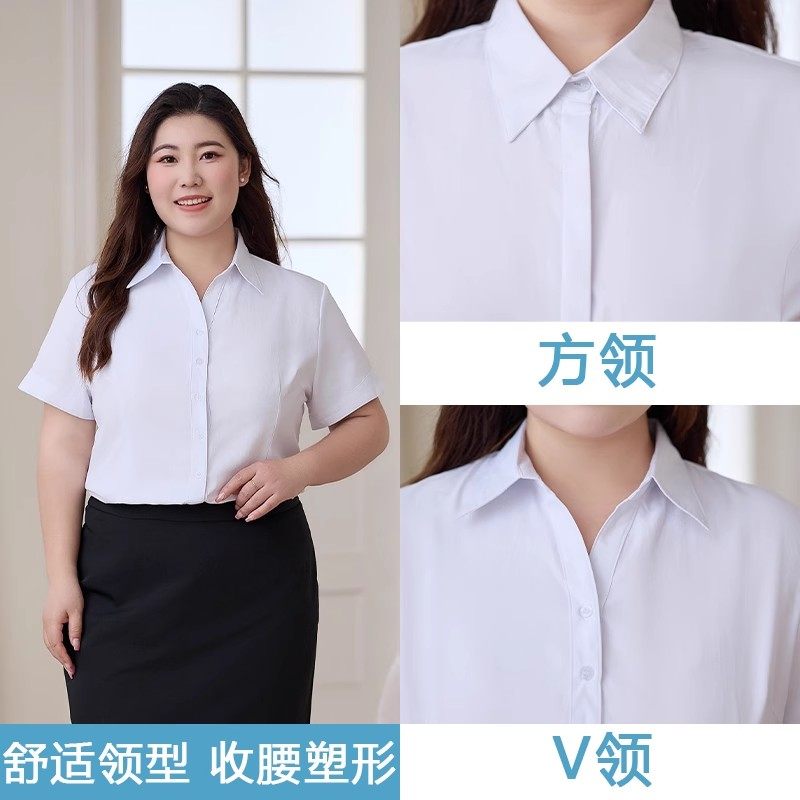 胖mm大码白色短袖衬衫女职业通勤翻领工作服女士气质修身蓝色衬衣