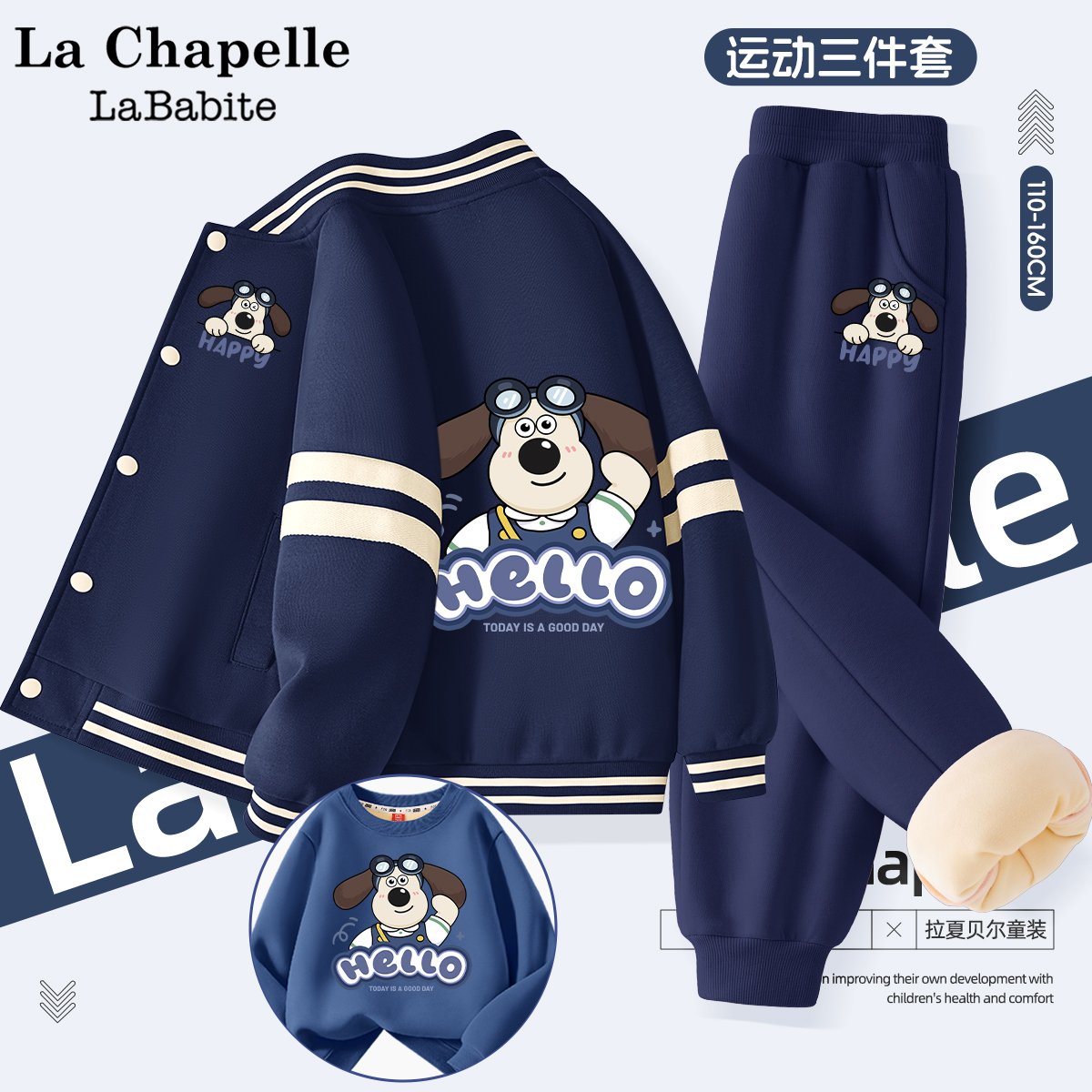 拉夏贝尔男童冬装套装2025新款夹棉棒球服加绒卫衣卫裤儿童三件套