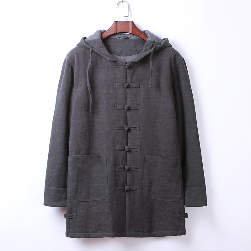 中式唐装棉袄加大码宽松加厚外套男士中长款中国风连帽亚麻棉衣