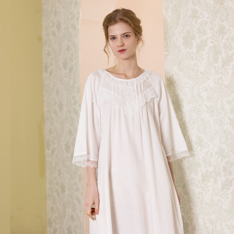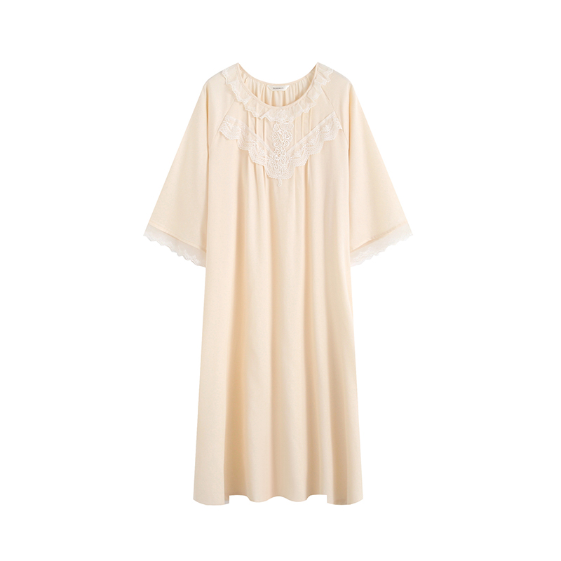 罗丝美七分袖睡裙女纯棉镶蕾丝花边60支直贡梭织布圆领套头14023