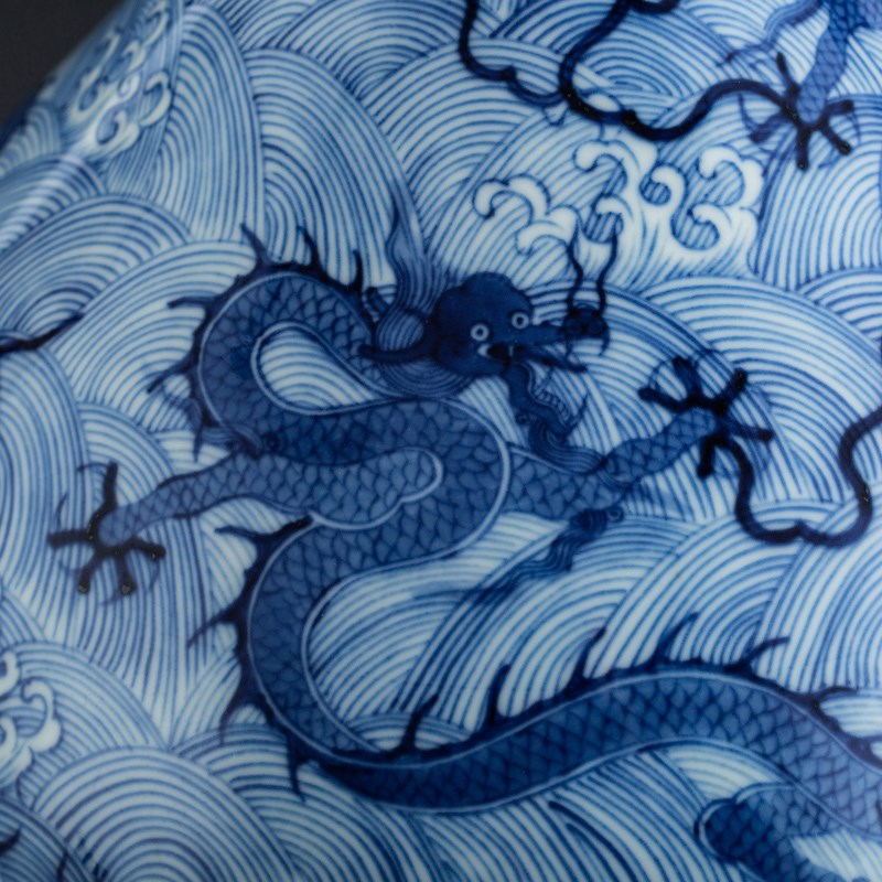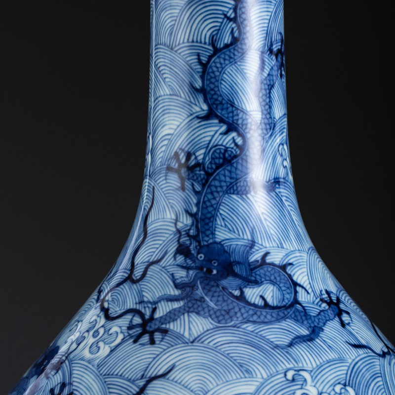 纯手绘青花淡描海浪九龙纹长颈大号胆瓶仿雍正陶瓷花瓶客厅摆件