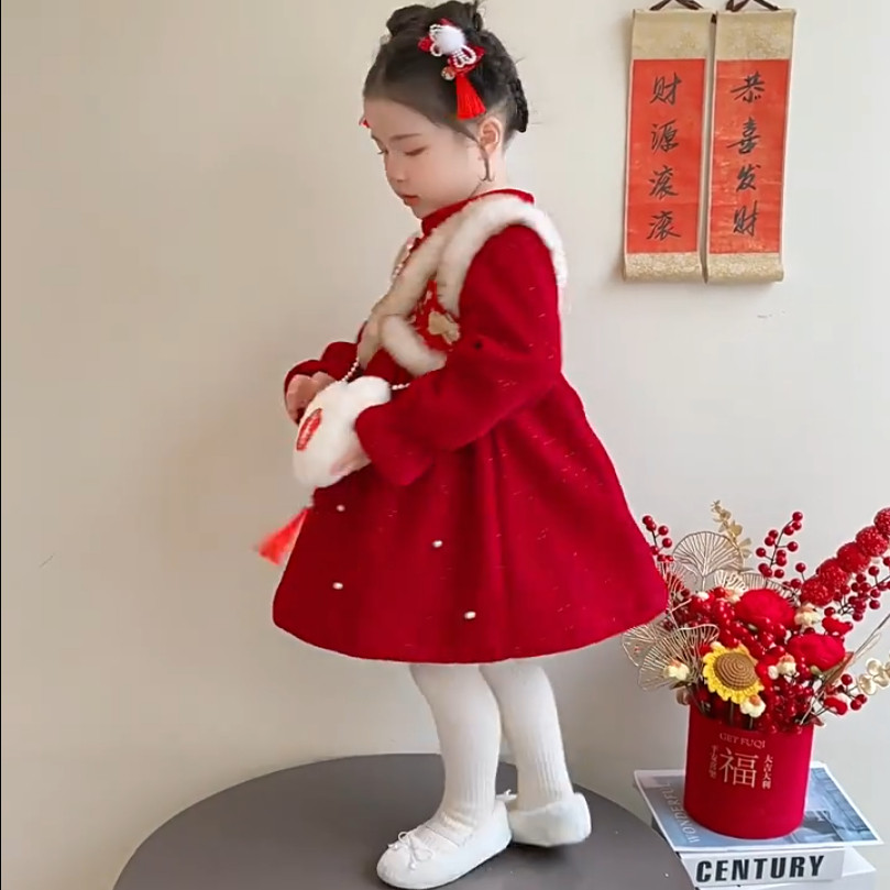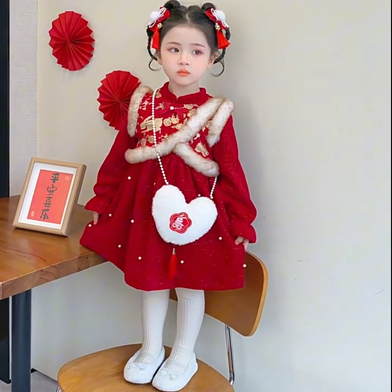 女童新中式旗袍连衣裙秋冬季加绒红色中国风拜年服洋气喜庆公主裙