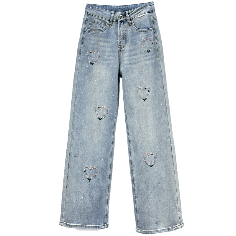 ins烫钻刺绣牛仔裤女薄款阔腿裤