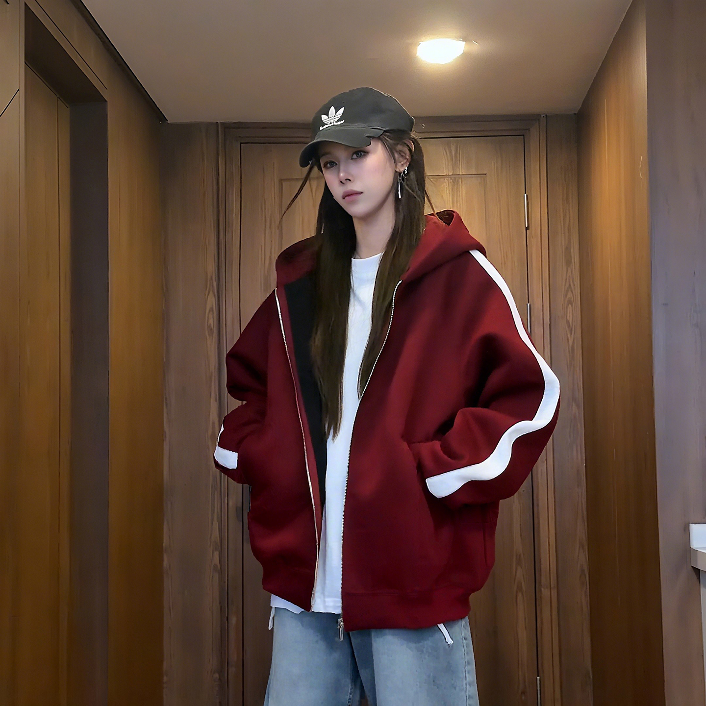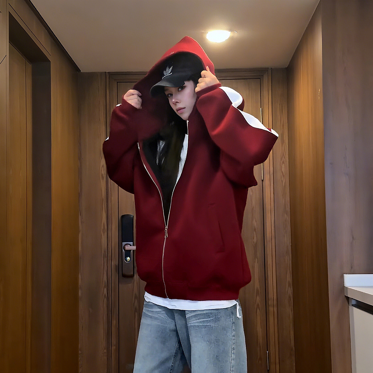 美式复古红色开衫卫衣男款秋季条纹拼接外套高级感痞帅情侣连帽衫