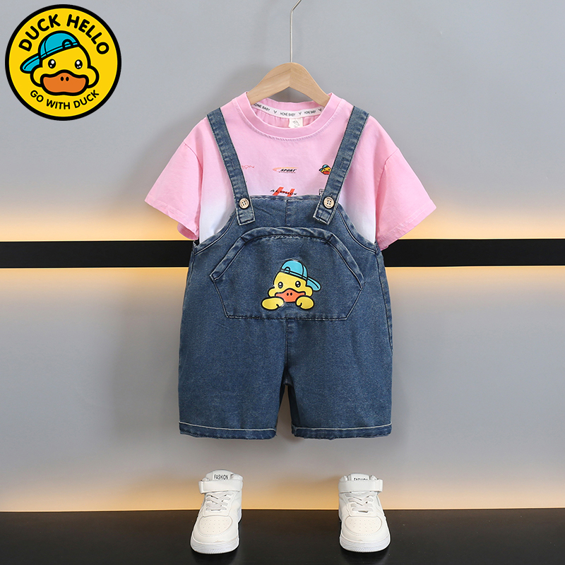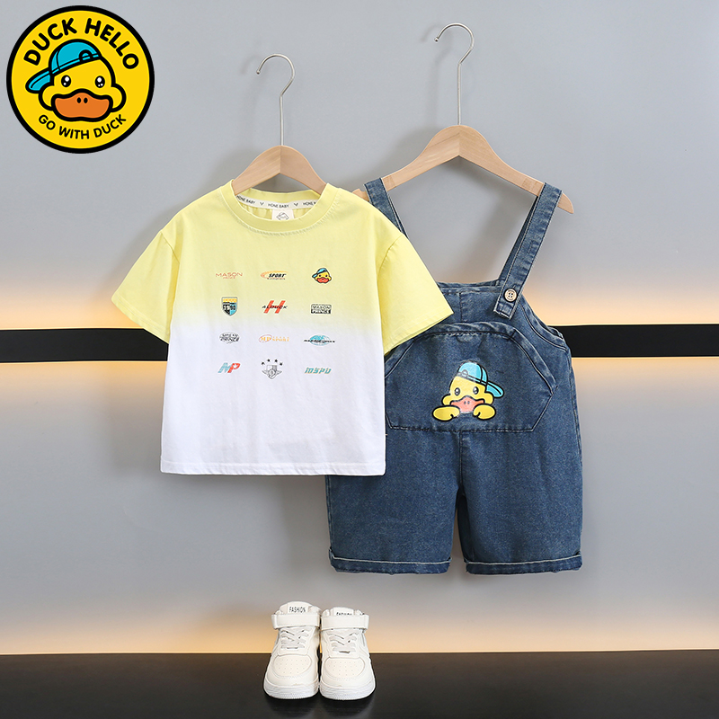 小黄鸭童装男童夏装套装儿童短袖卡通POLO衫宝宝牛仔背带裤两件套