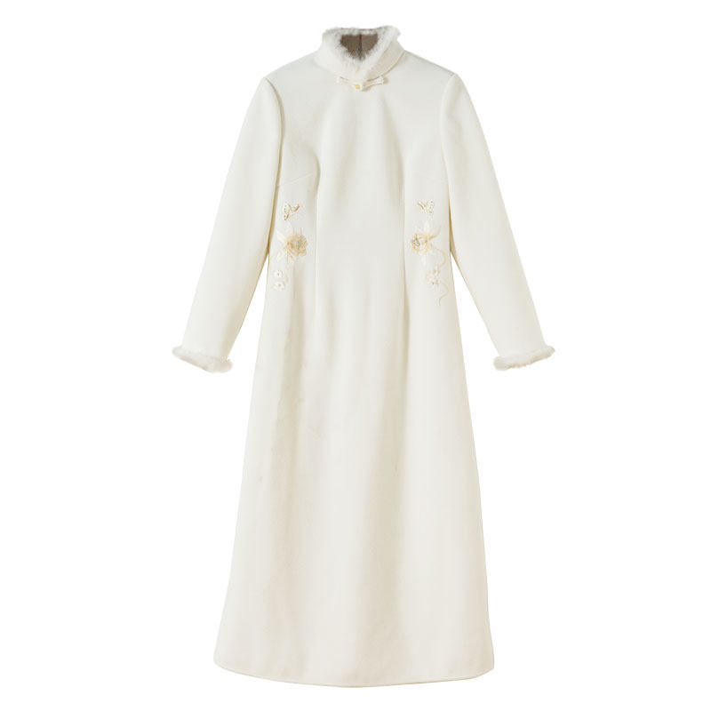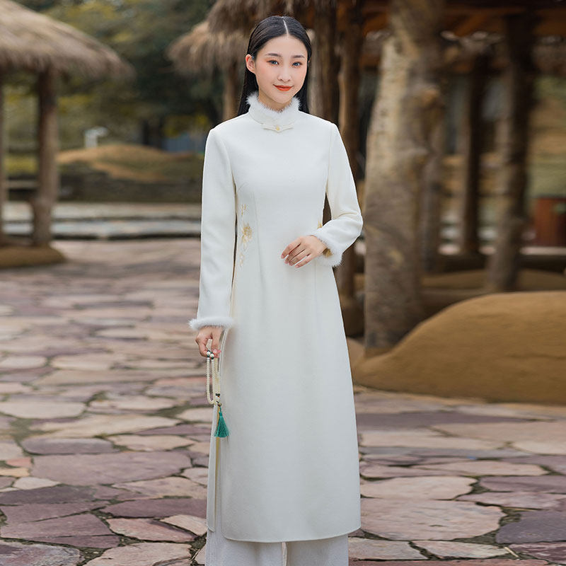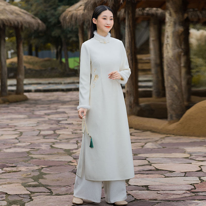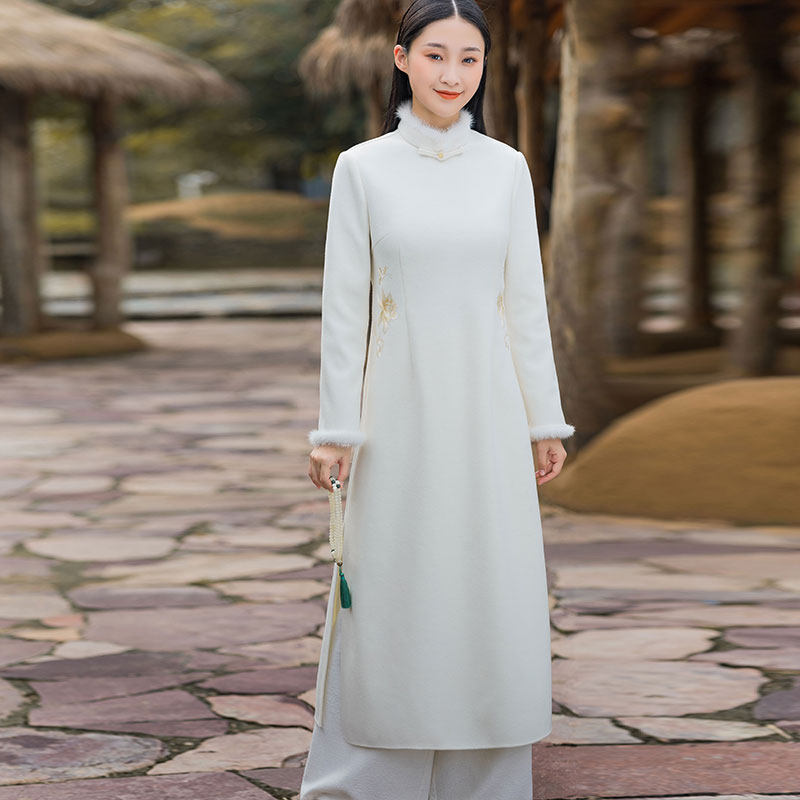 春秋中国风毛呢连衣裙改良旗袍茶服立领修身唐装古典长款禅意女装