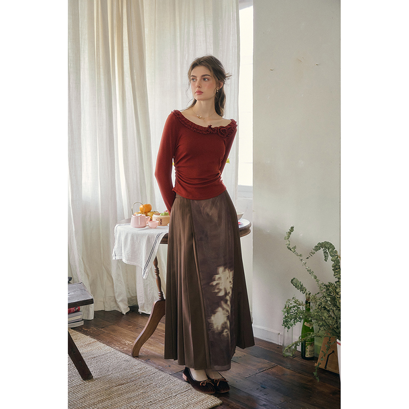 SimpleRetro圣诞红 法式立体花朵长袖打底衫女抽褶加绒针织衫毛衣