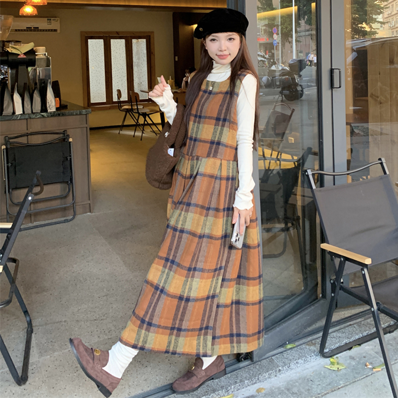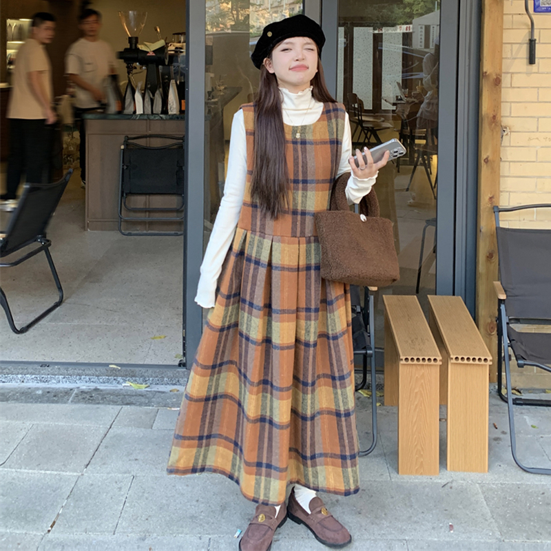 大码女装2025秋季新款胖mm森系复古毛呢格子背心裙+奶杏打底套装