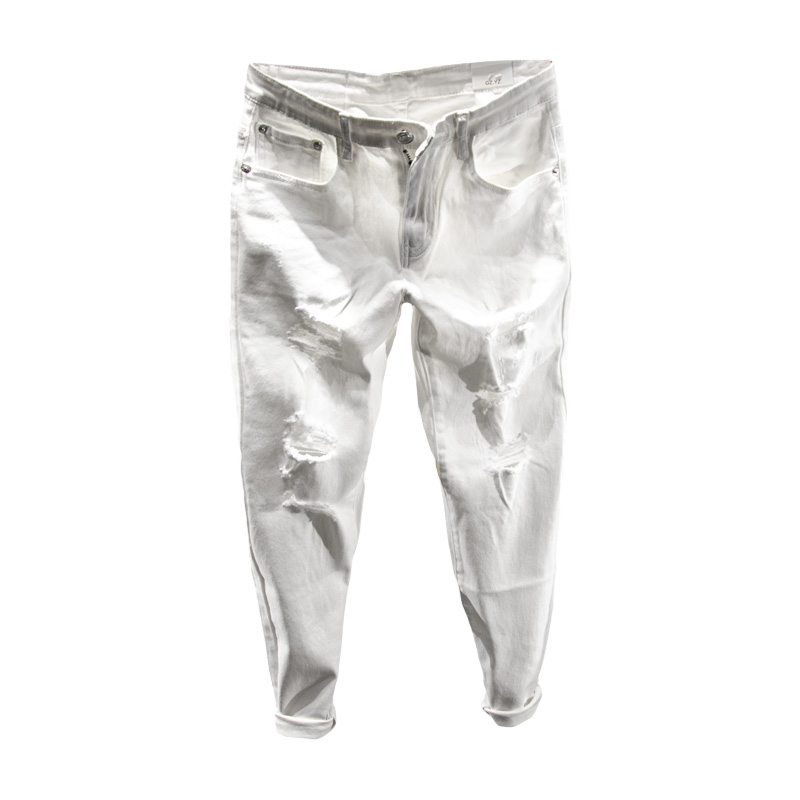 三古木棉白色破洞牛仔裤男修身小脚夏季新款潮流休闲乞丐九分裤
